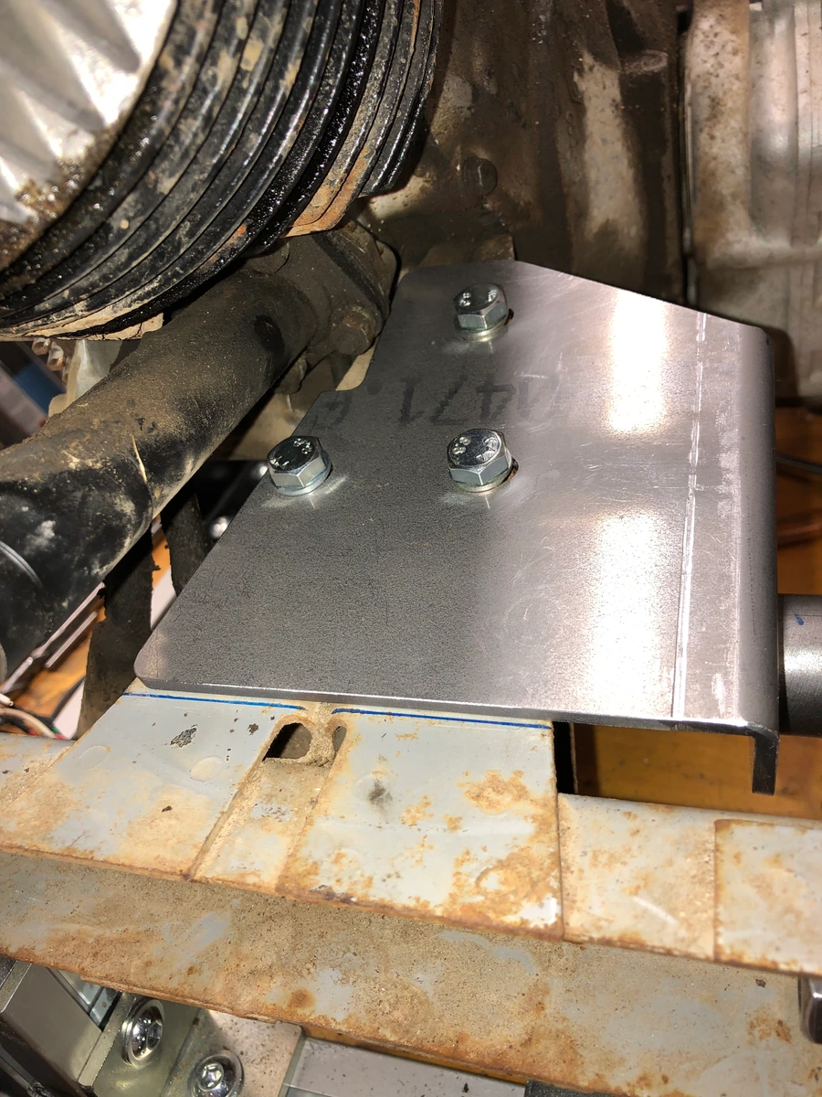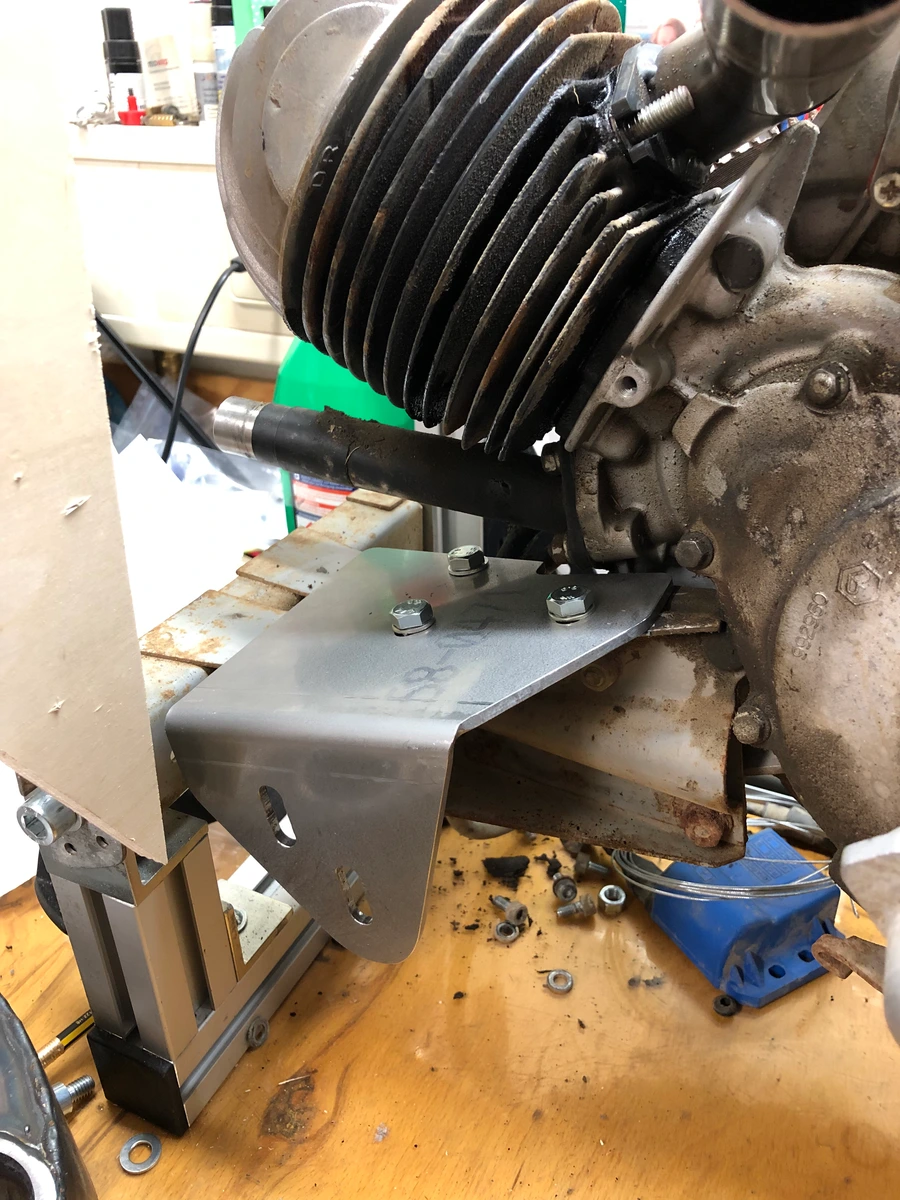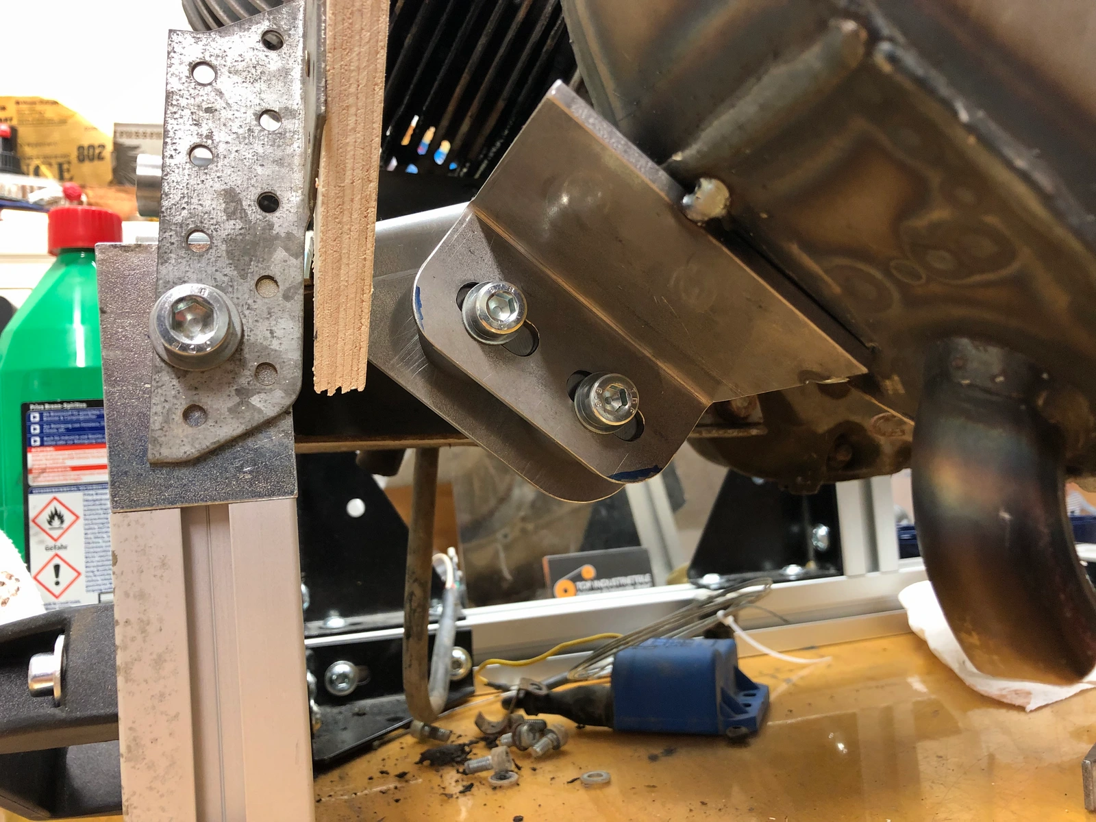 Der Haltewinkel am Motorträger fügt sich jetzt schön ein und ich muß keine Änderung am Motorträger vornehmen. Zwei der 3 Schrauben gehen in Gewindebuchsen, die ohnehin für den Originalauspuff dran sind, die 3. Schraube geht durch eine Bohrung, die ebenfalls vorhanden ist.