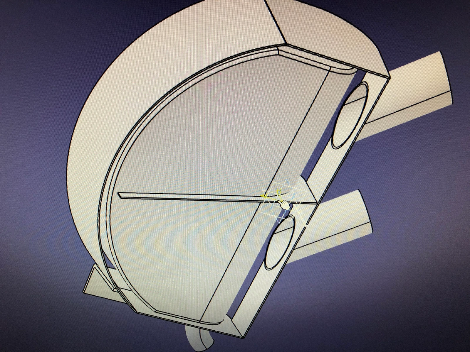 Die Trennwand zwischen der Zuluft und Abluftseite habe ich mal modelliert. Die hängt schräg drin, weil auf der anderen Seite die Muffe im Weg ist. So ungefähr werden auch die Schlauchanschlüsse zum Liegen kommen: