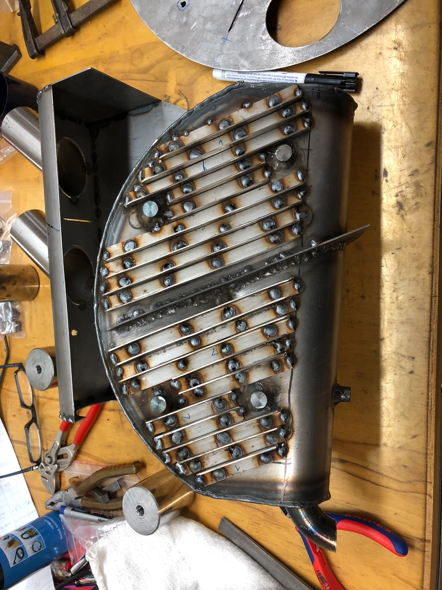 Eigentlich müssten die Winkel ja vollflächig mit dem Auspuff verbunden sein für den besten Wärmeübergang. Ich werde sie halt punkten.