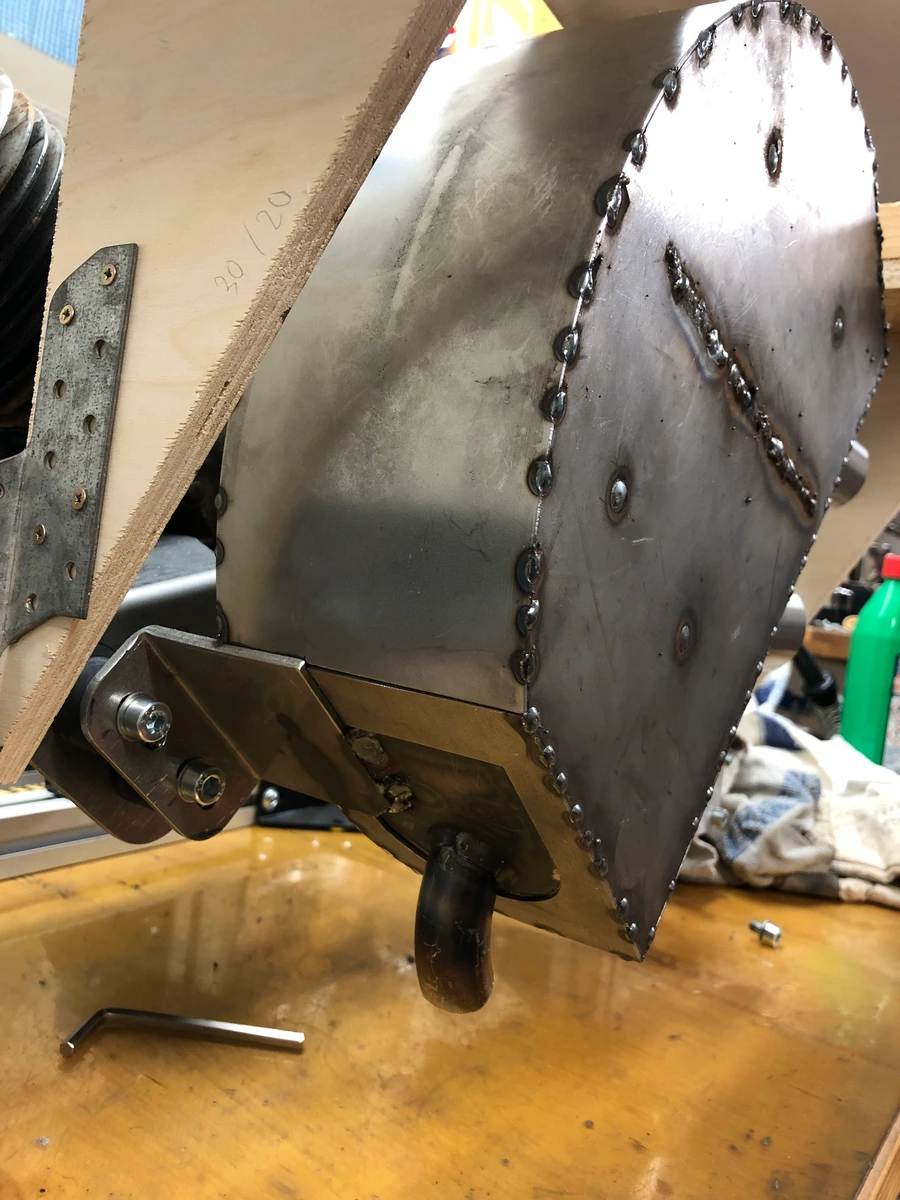 Das hier ist jetzt völlig anders. Geometrisch relativ einfach, ich kann es bequem auf der Werkbank anpassen und optimieren. Das macht deutlich mehr Spaß. Und mit Blech zu arbeiten finde ich eigentlich ganz spannend. Das Blech ist übrigen 1,5 mm. Damit wird das besser schweißbar und es ist steifer. Wenn ich dann die Außenhaut noch an ein paar Stellen mit dem inneren Briefkasten verschweiße, sollte das sehr schwingungsarm werden und kein Geigenkasten.