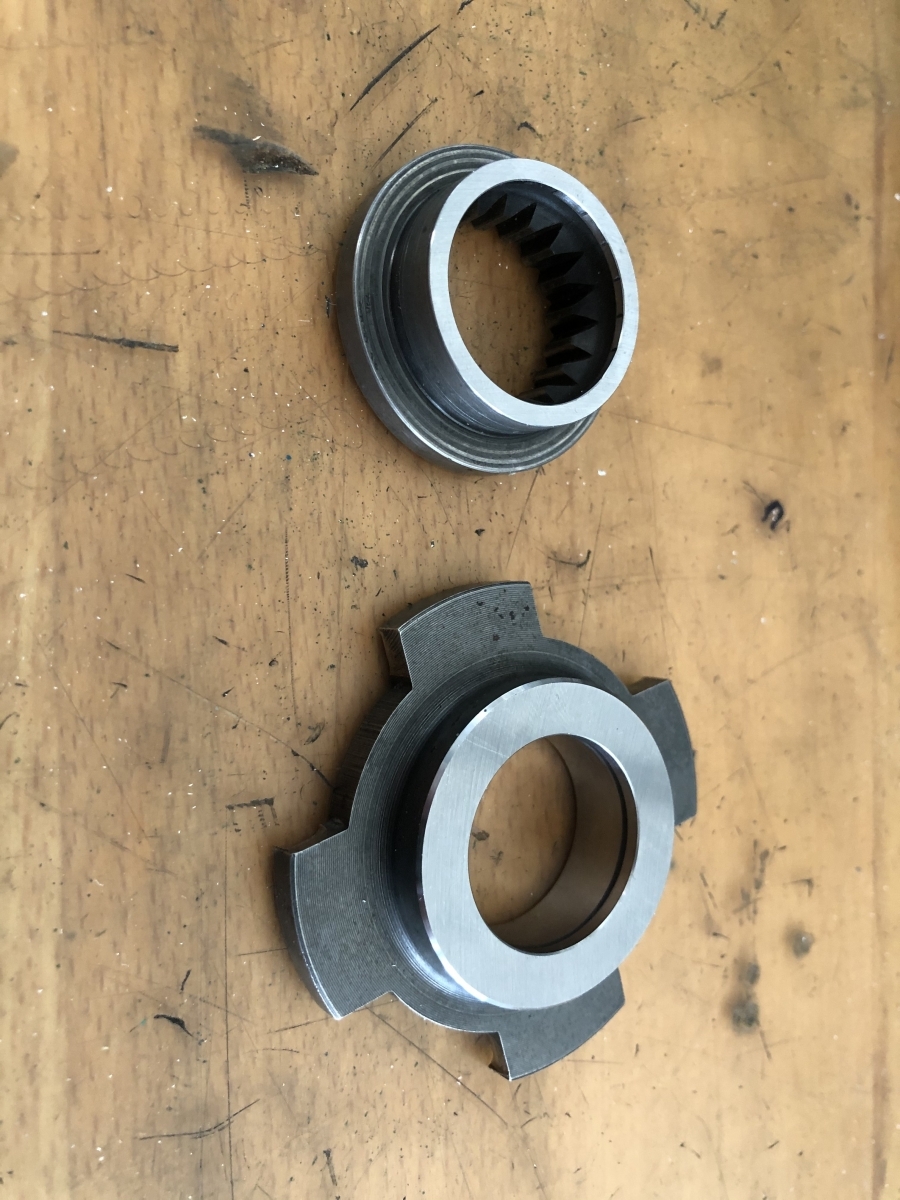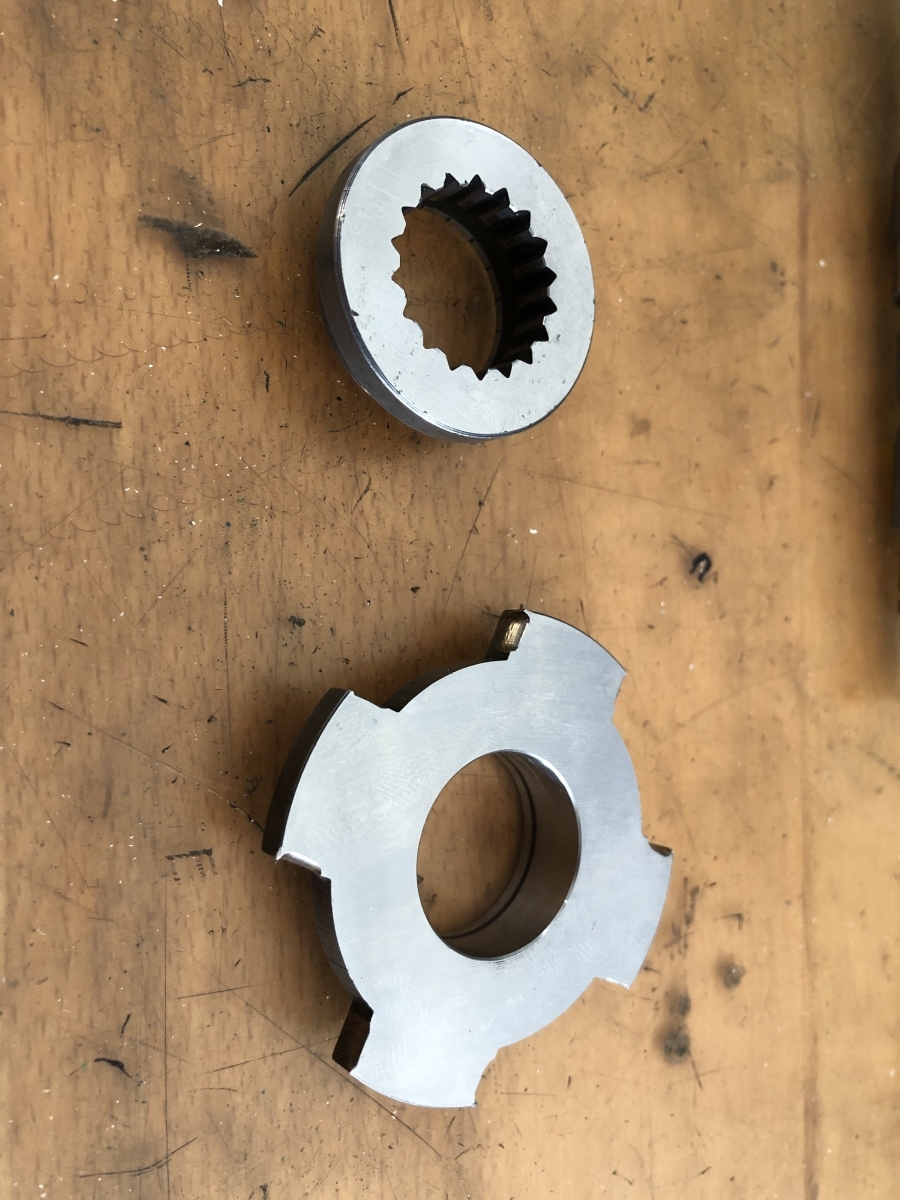 Der Mitnehmer mit den vier Flügeln ist auf Maß gepreßt, aber noch nicht verschweißt. Der liebe Kollege, der mir das mit Zusatz für harte Materialien in WIG schweißen kann, hat gerade Urlaub.