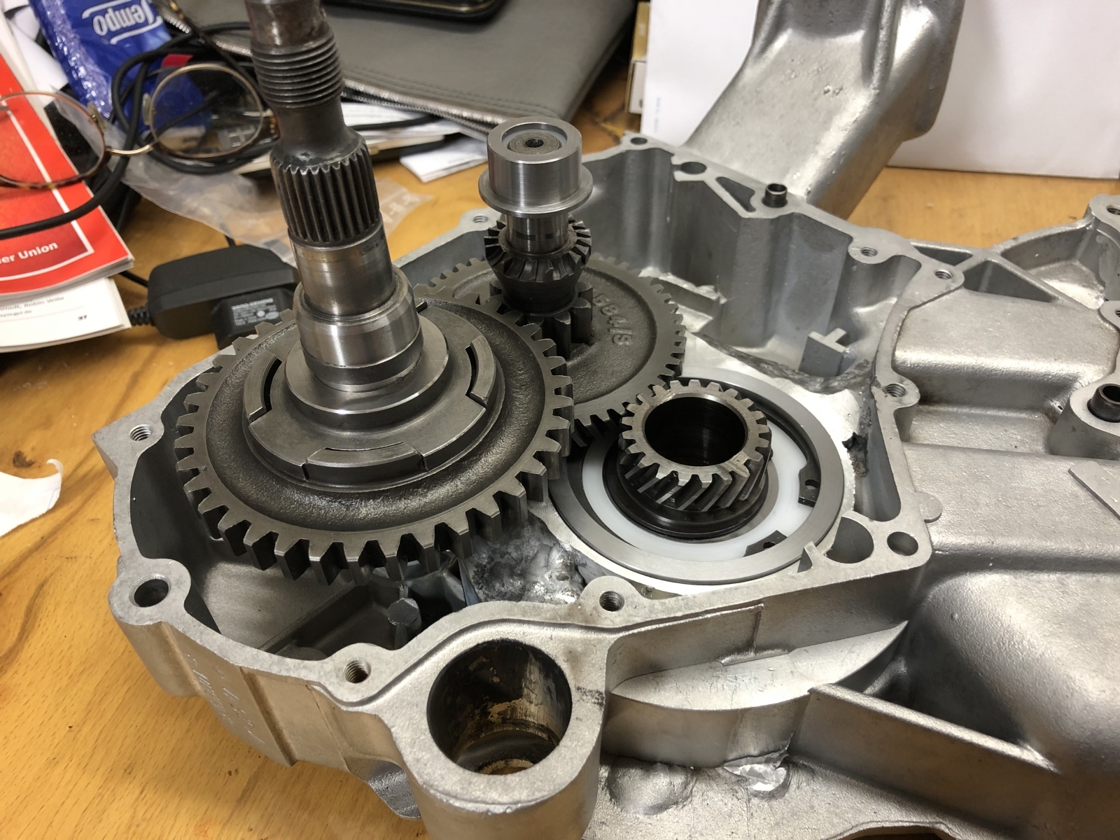 Vorher muß ich noch die Lager ziehen an der Wandlereinheit, weil die ja bei mir entfallen. Die drehbare Lagerung des Wandlers verlagert sich bei mir in das Eingangsrad und in die noch verblieben Nadelhülse im Getriebedeckel.