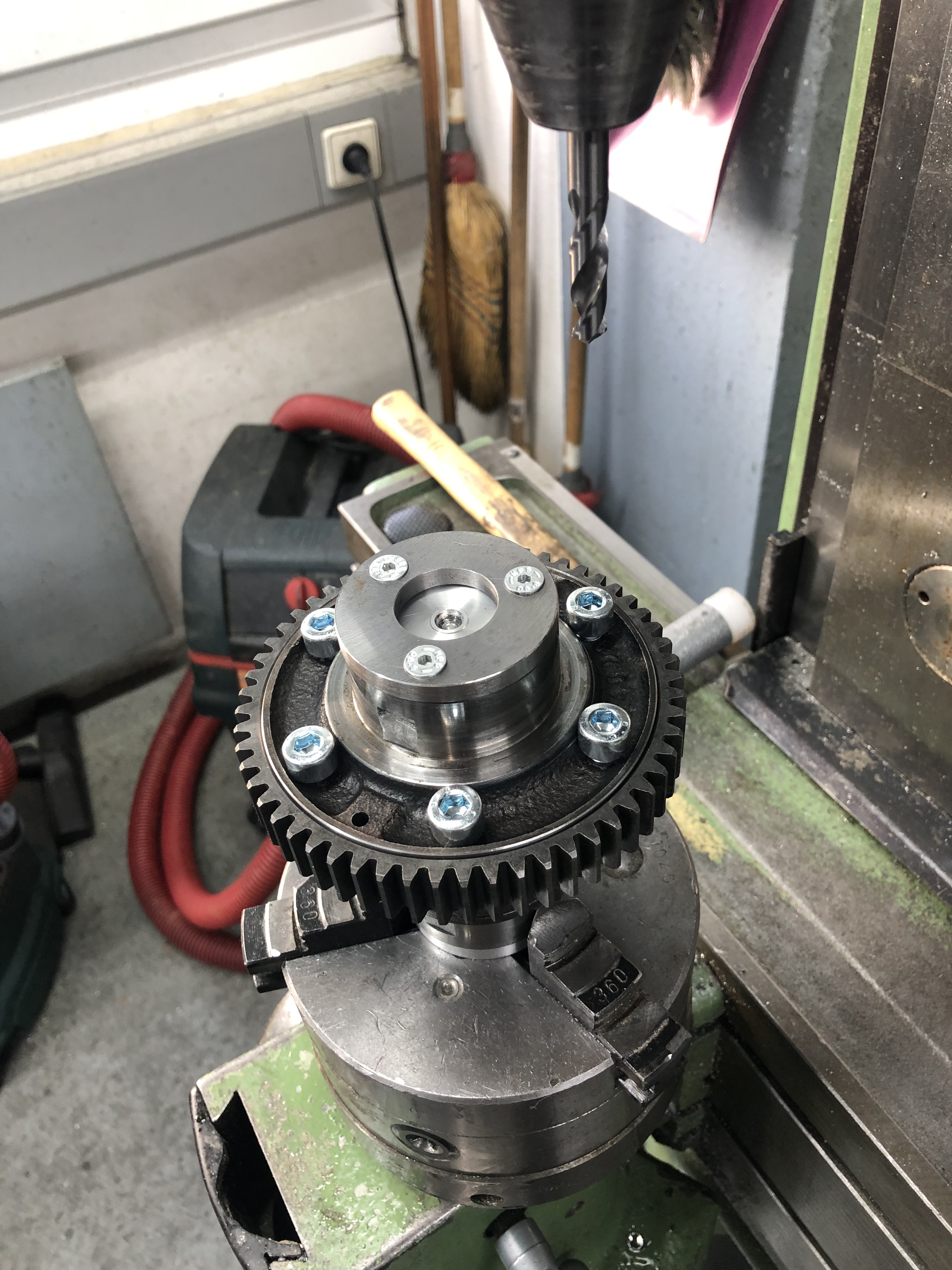 Dann habe ich zuerst die Schultern am Hauptrad nachgesetzt, aber nicht genau den einen Millimeter pro Seite wegen der Anlaufscheiben, sondern etwas weniger.