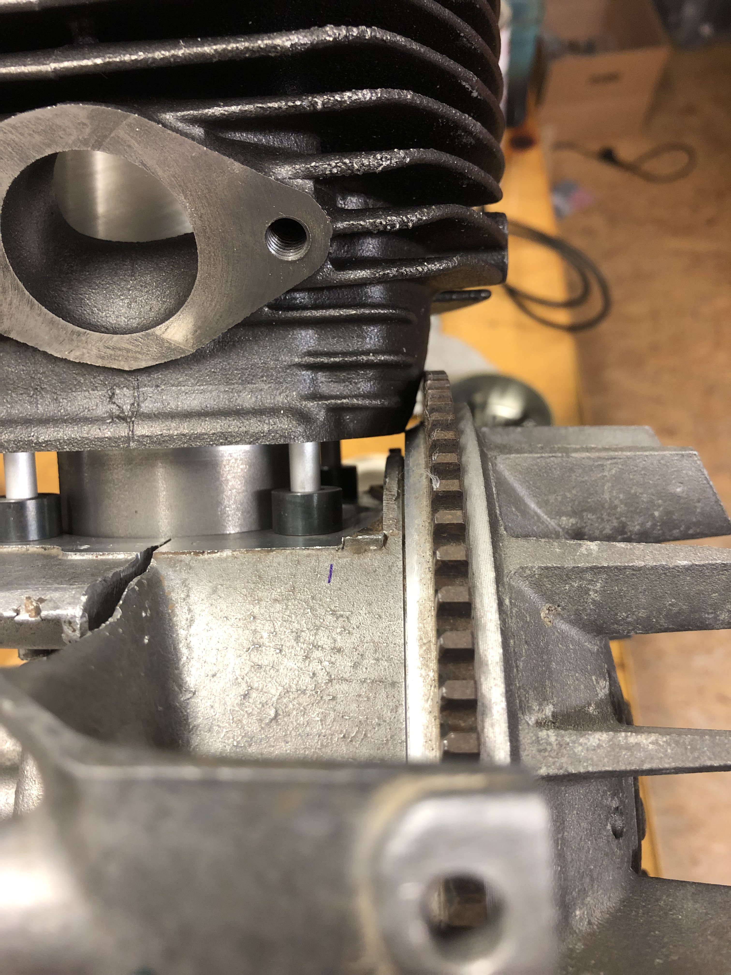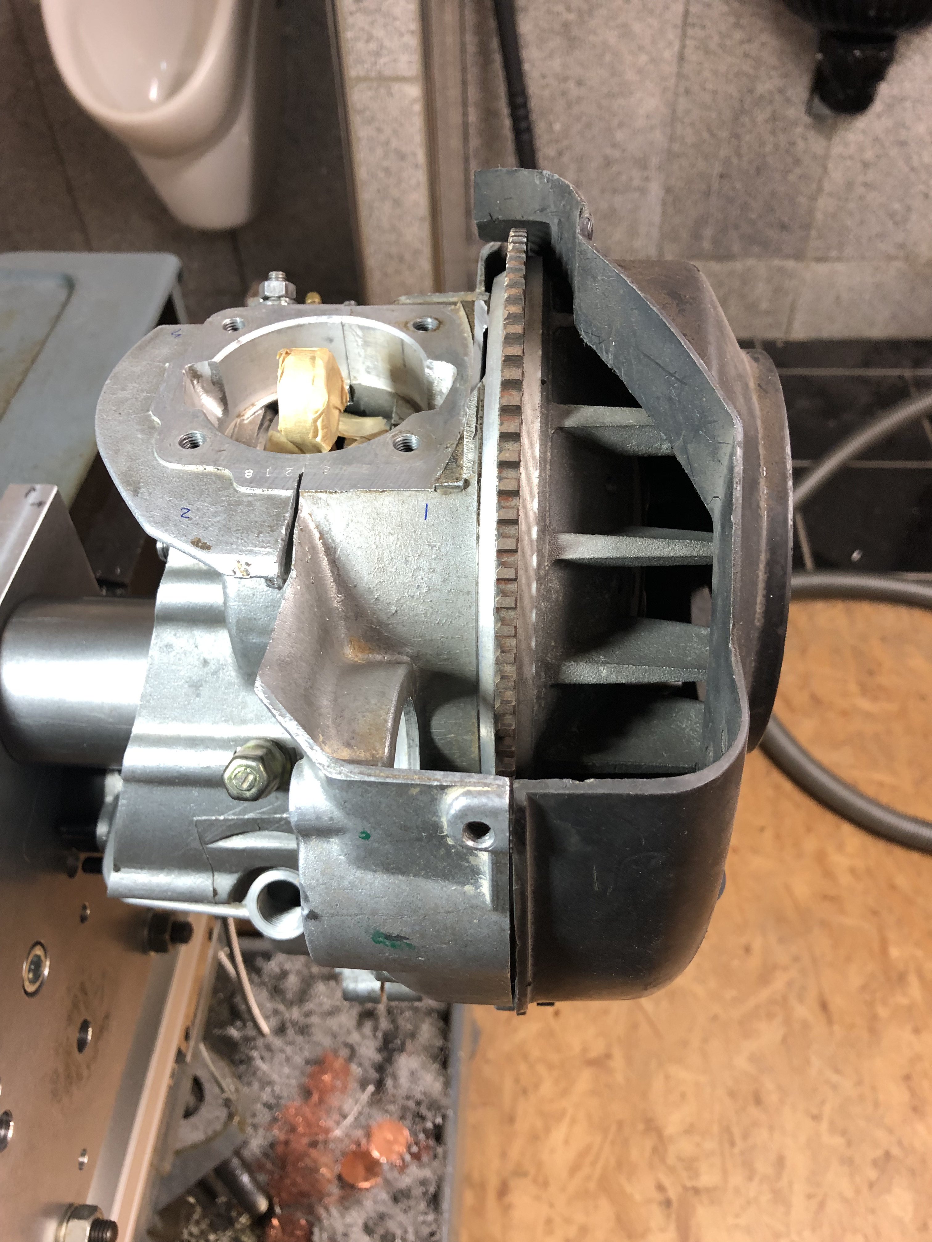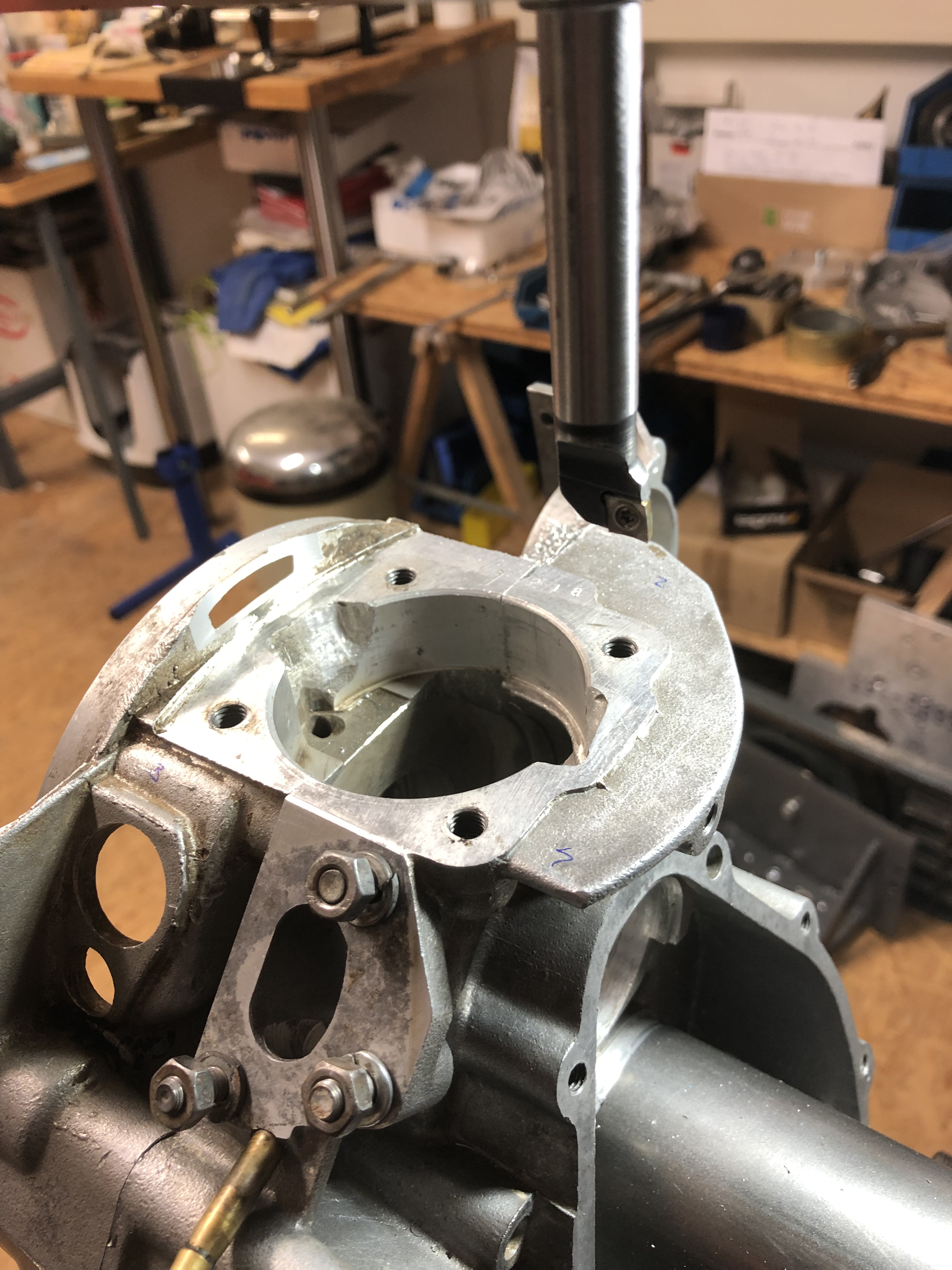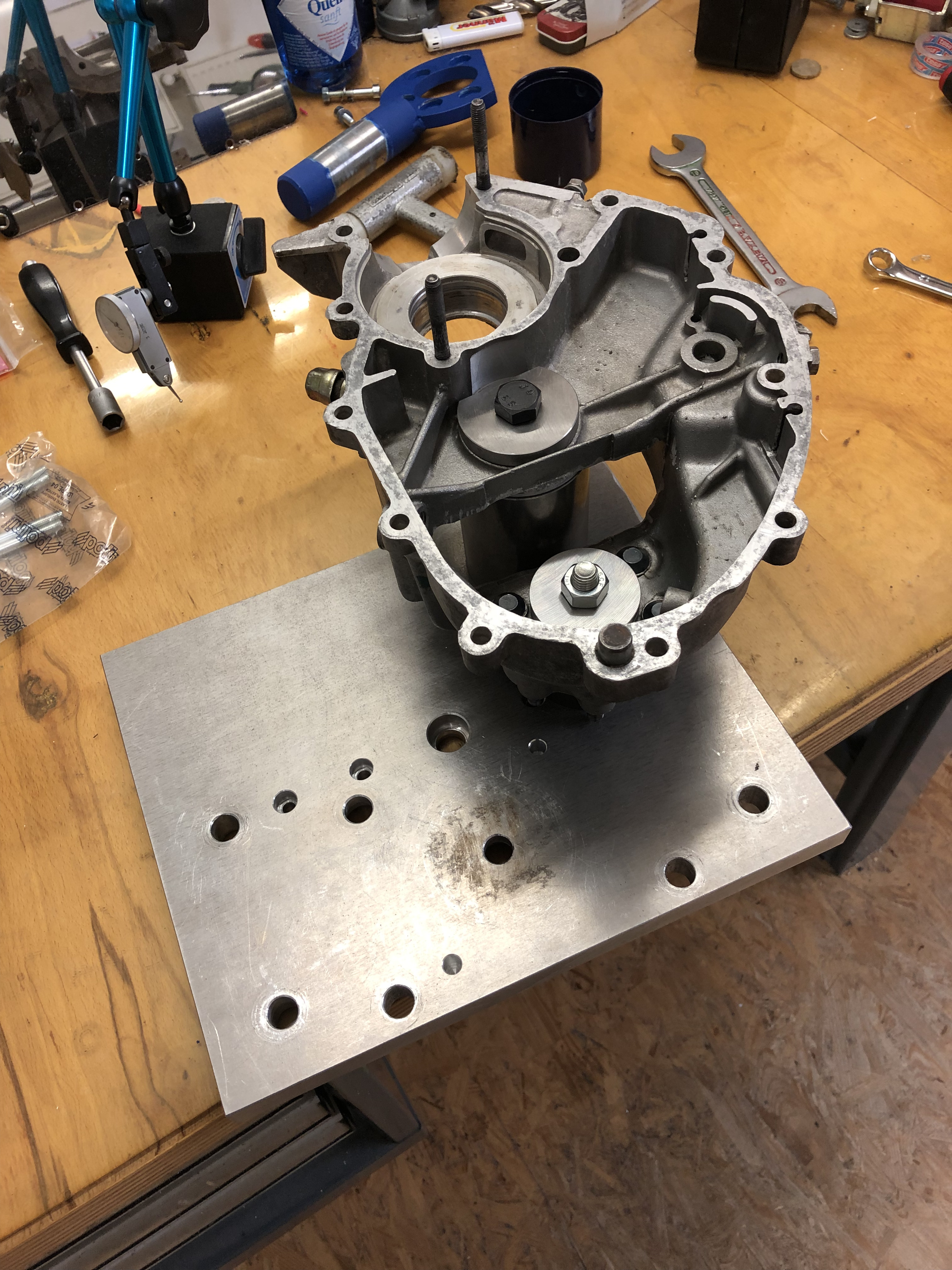 Ich muß morgen mal schauen, ob ich die Kurbelwelle drin lassen kann währen der Bearbeitung, dann kann ich nach dem ersten Durchbrechen das Polrad mal drauf stecken und kucken, wo ich bin.