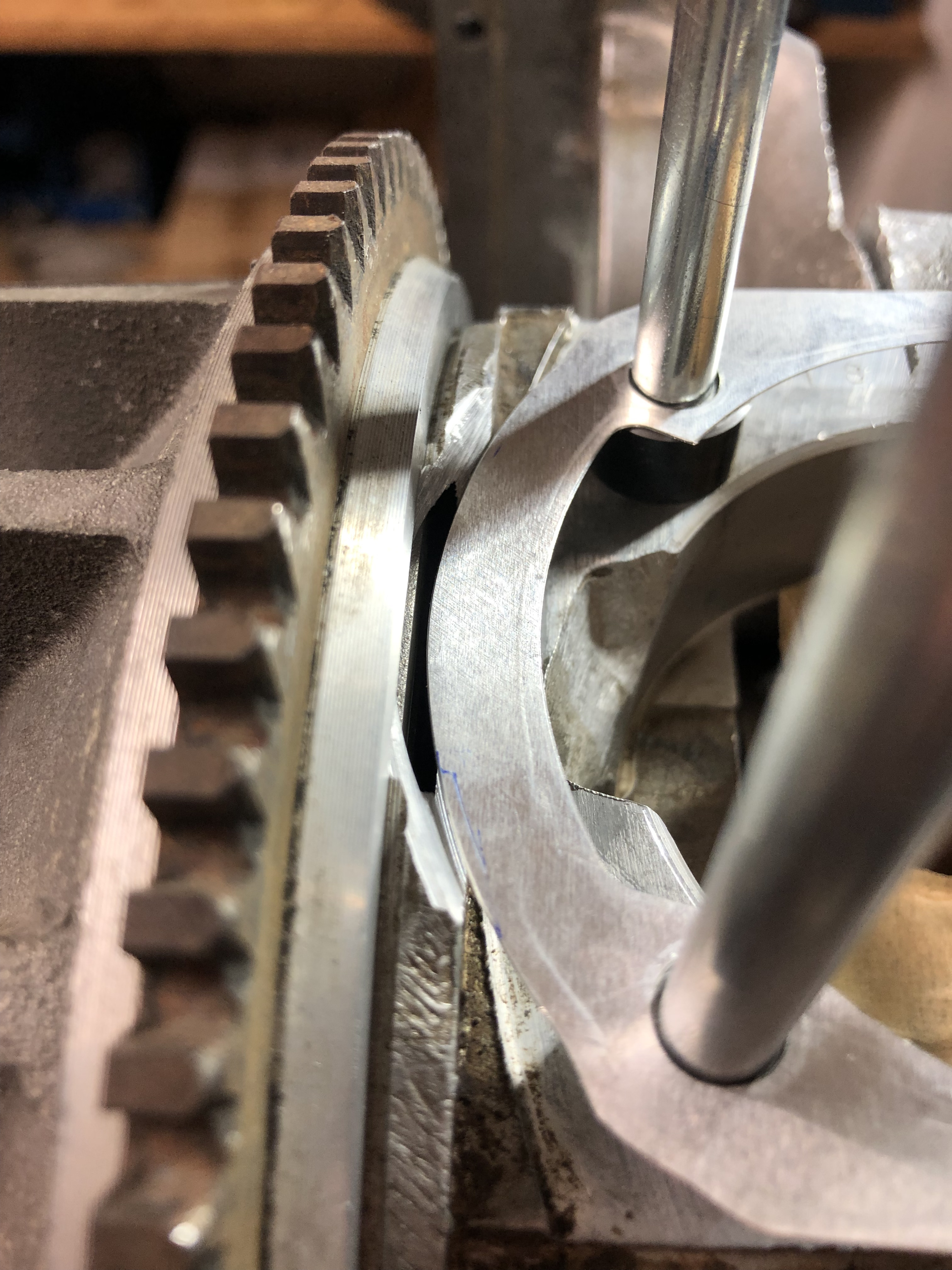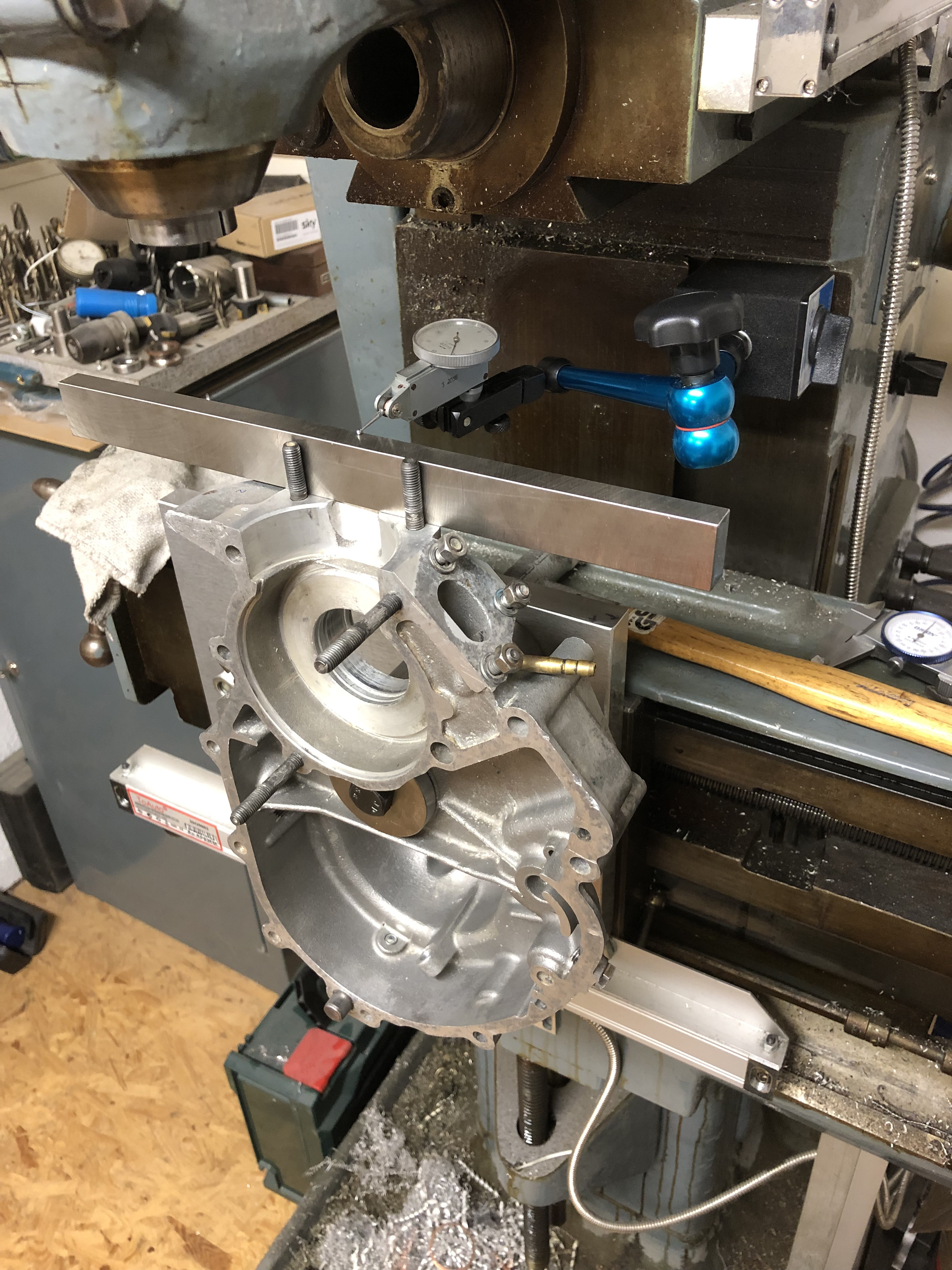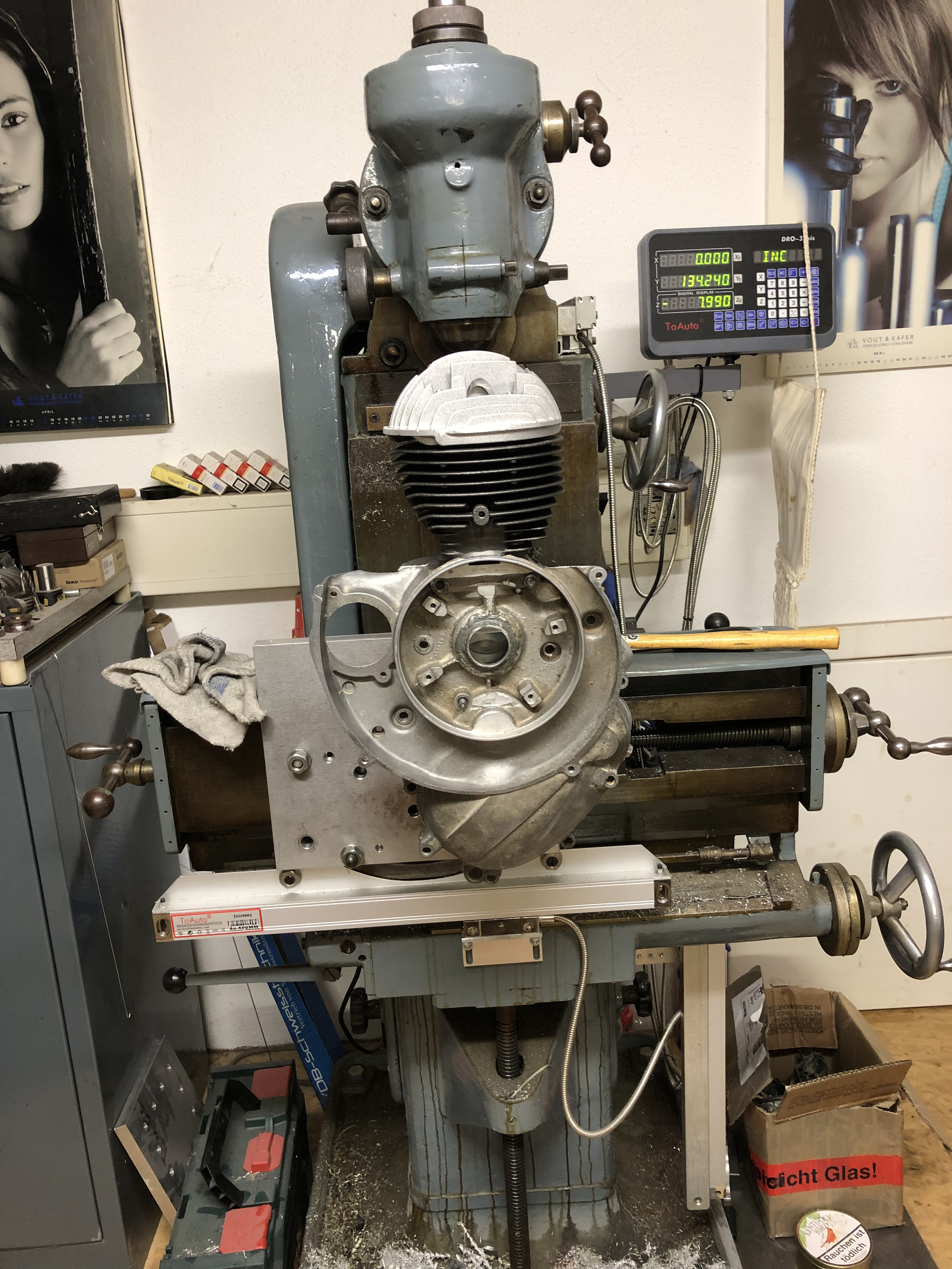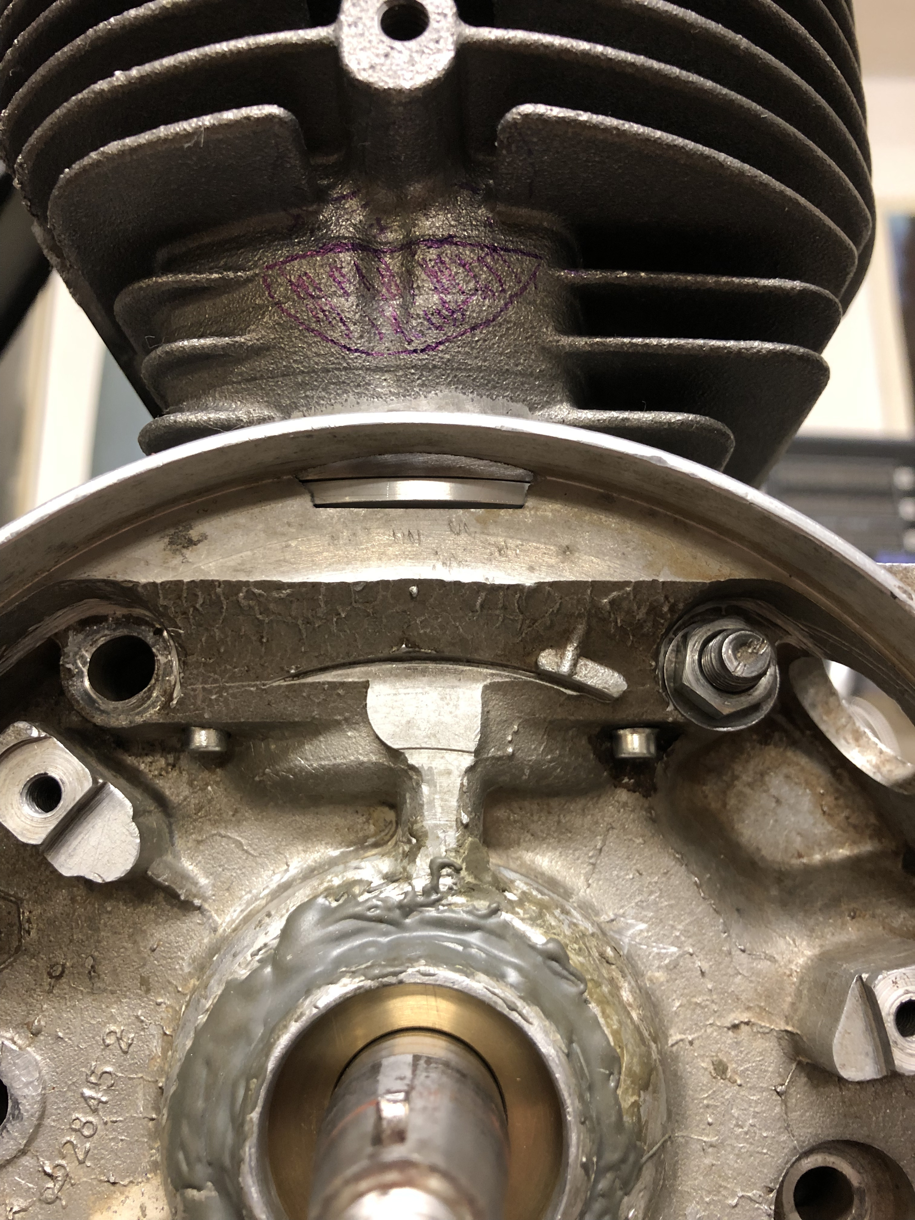 Ich muß morgen mal schauen, ob ich die Kurbelwelle drin lassen kann währen der Bearbeitung, dann kann ich nach dem ersten Durchbrechen das Polrad mal drauf stecken und kucken, wo ich bin.