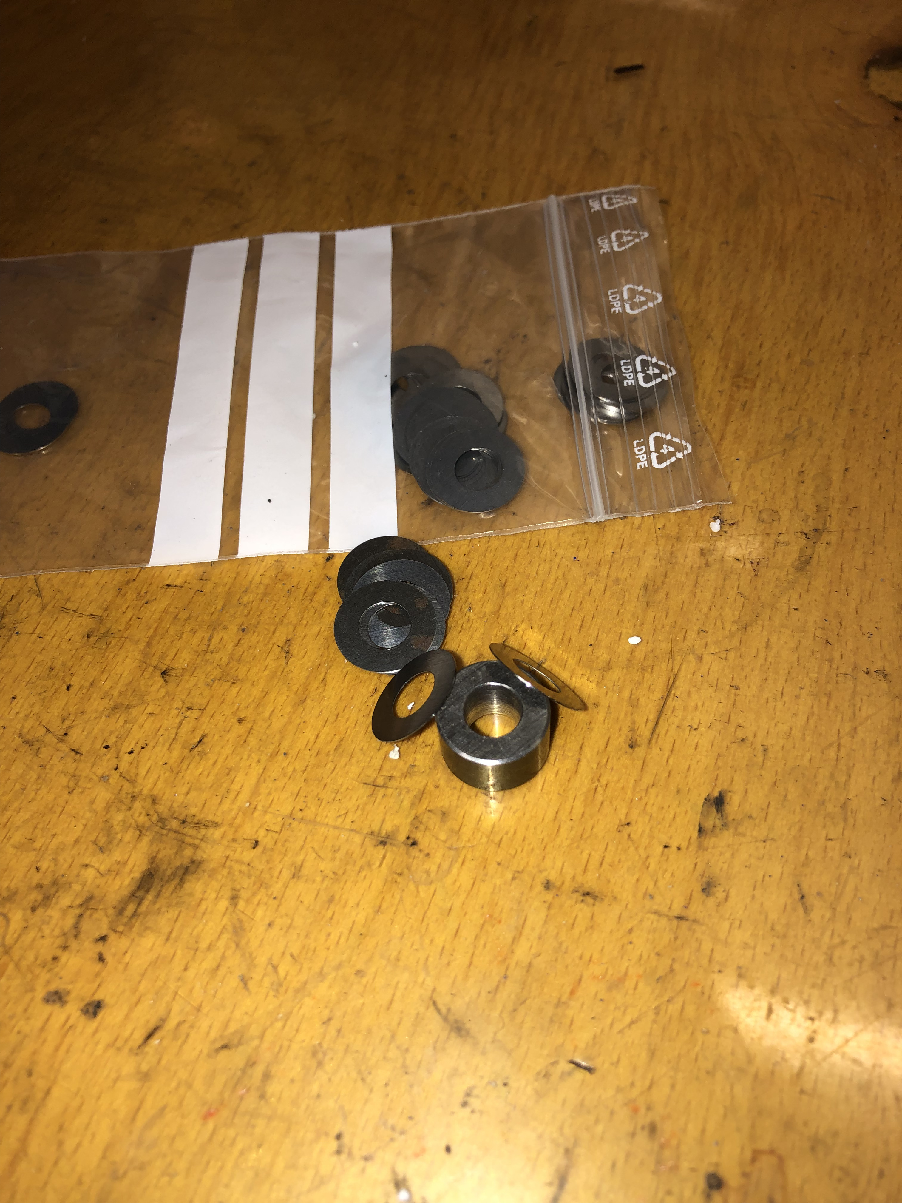Dann habe ich schrittweise mit dem Ausdrehkopf auf Höhe 4,5mm über Dichtfläche bearbeitet, bis ich knapp über den 94 mm war, die der Spacer haben wird. Meine 8 mm Unterlagen gesteckt und einen Polinispacer aufgelegt: