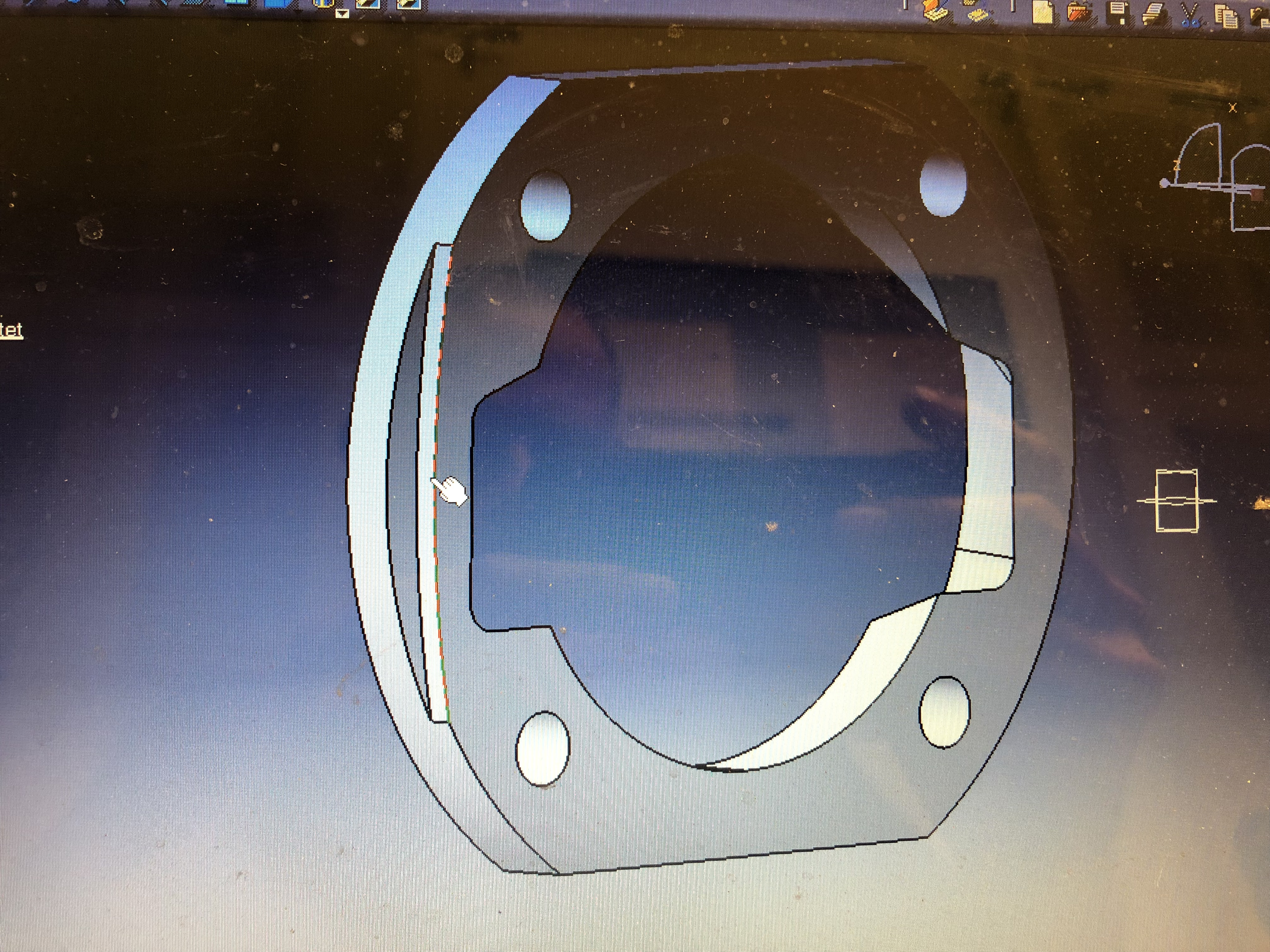 Da ich auf der Dichtfläche nichts fräsen will, mußte ich noch den halbmondförmigen Fräserauslauf genau berücksichtigen, mit dem Piaggio die Dichtfläche erstellt hat. Über drei Punkte ergab sich ein Radius von 118,5, ergo wird der Flugkreis 240 mm gewesen sein, um 77 aus der Mitte.
