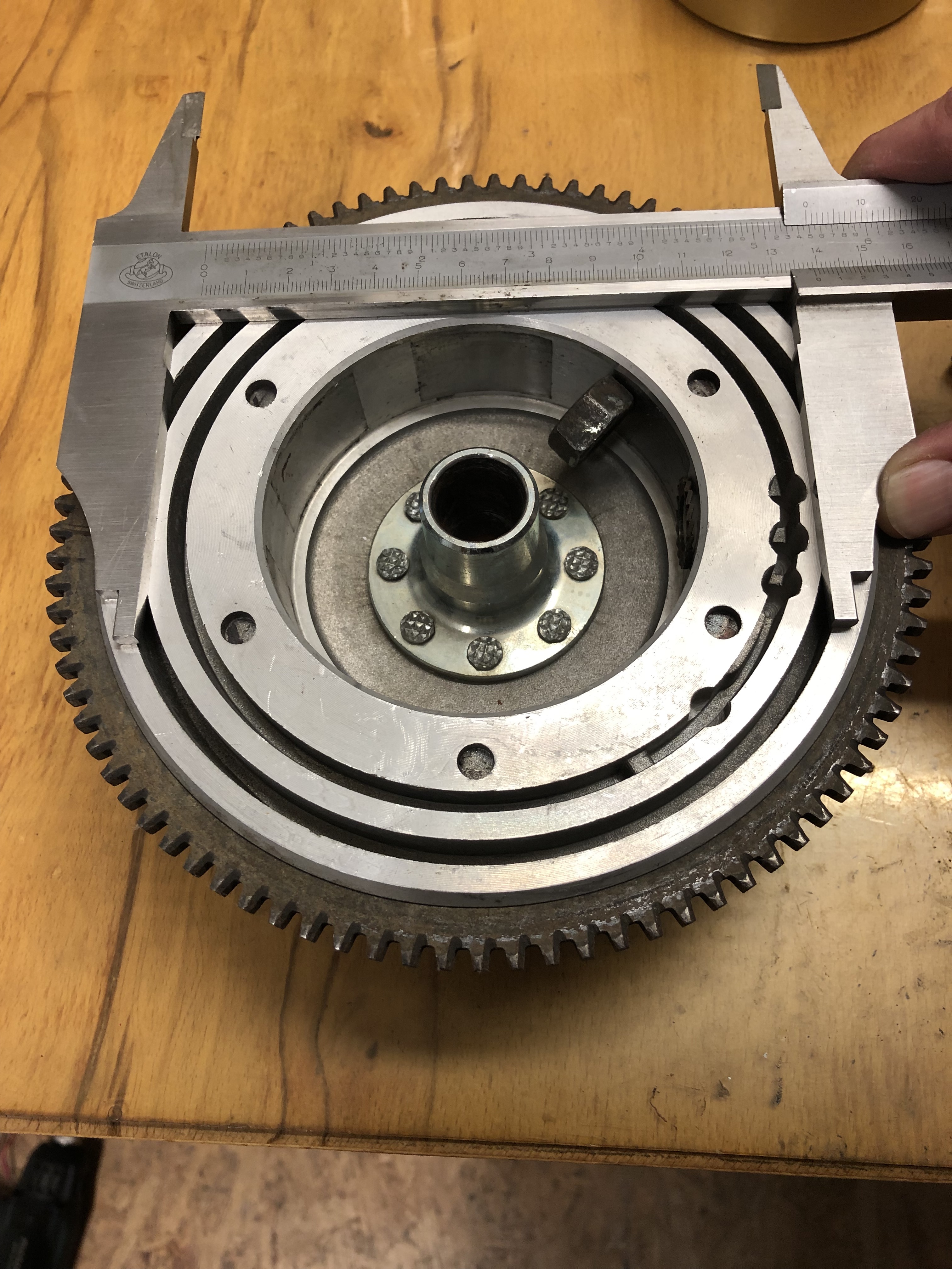 So, und jetzt wird es interessant. Diese 69,5, also im Durchmesser 139 mm liegen außerhalb der Wuchtbohrungen im Polrad: