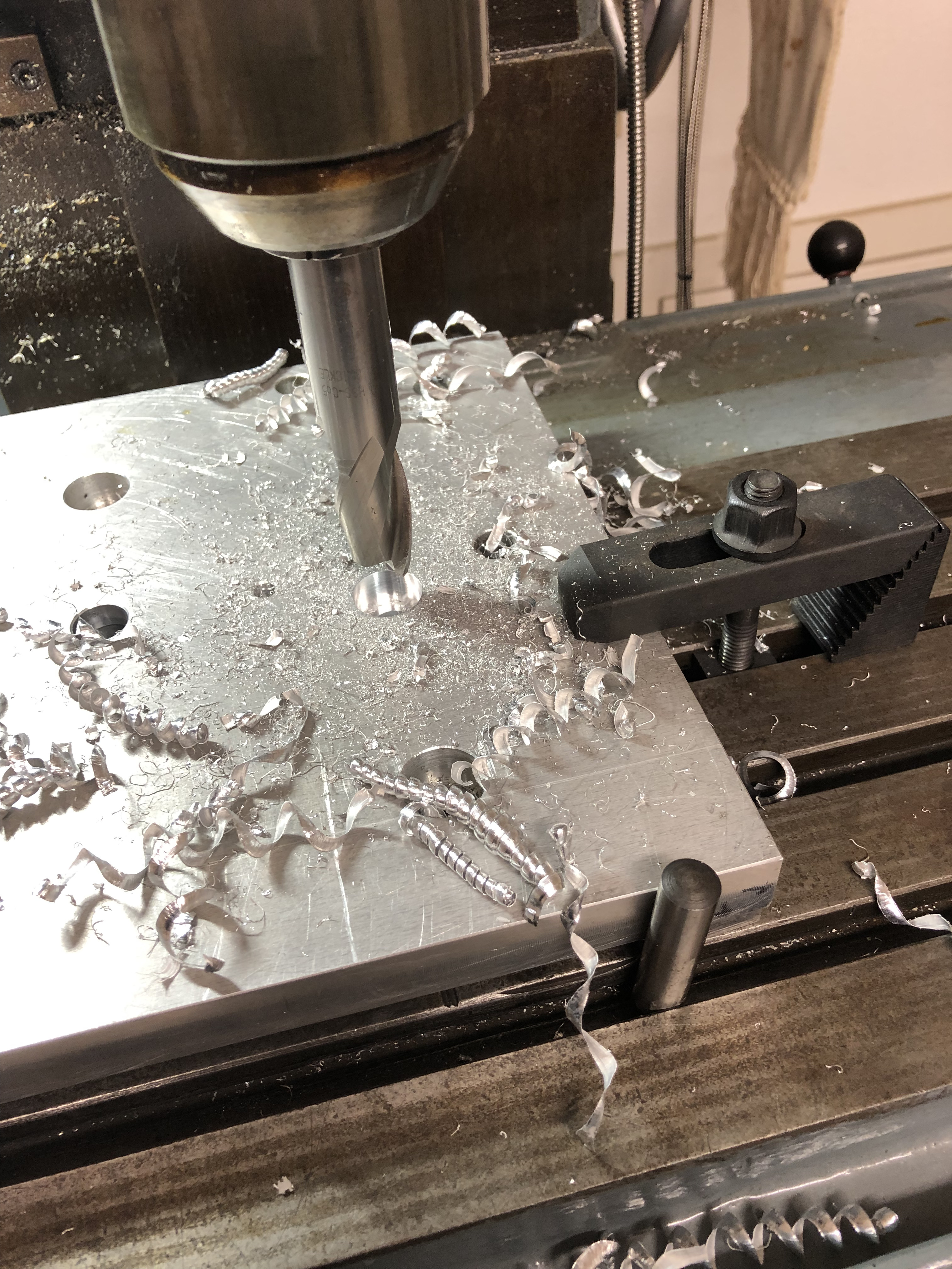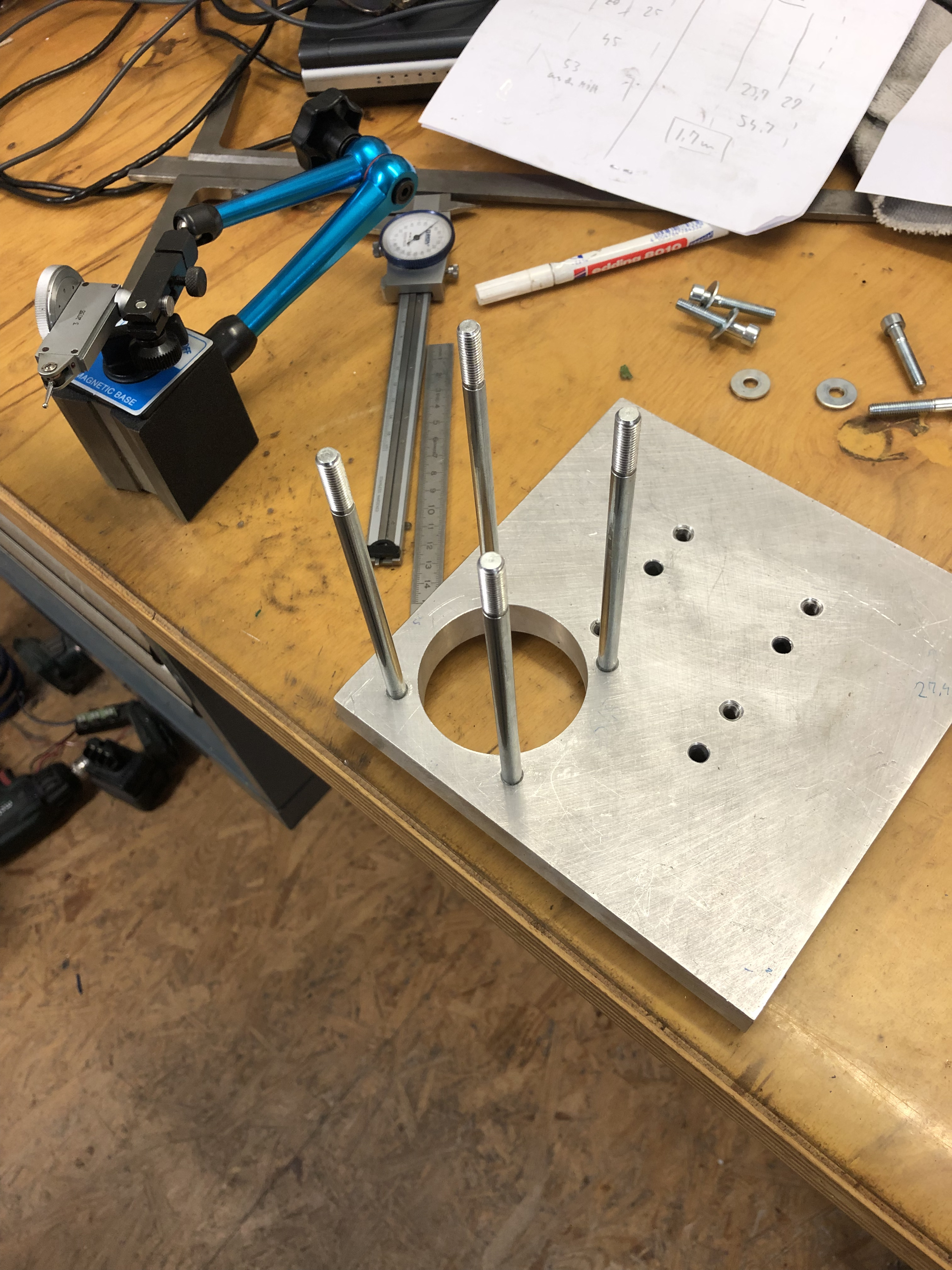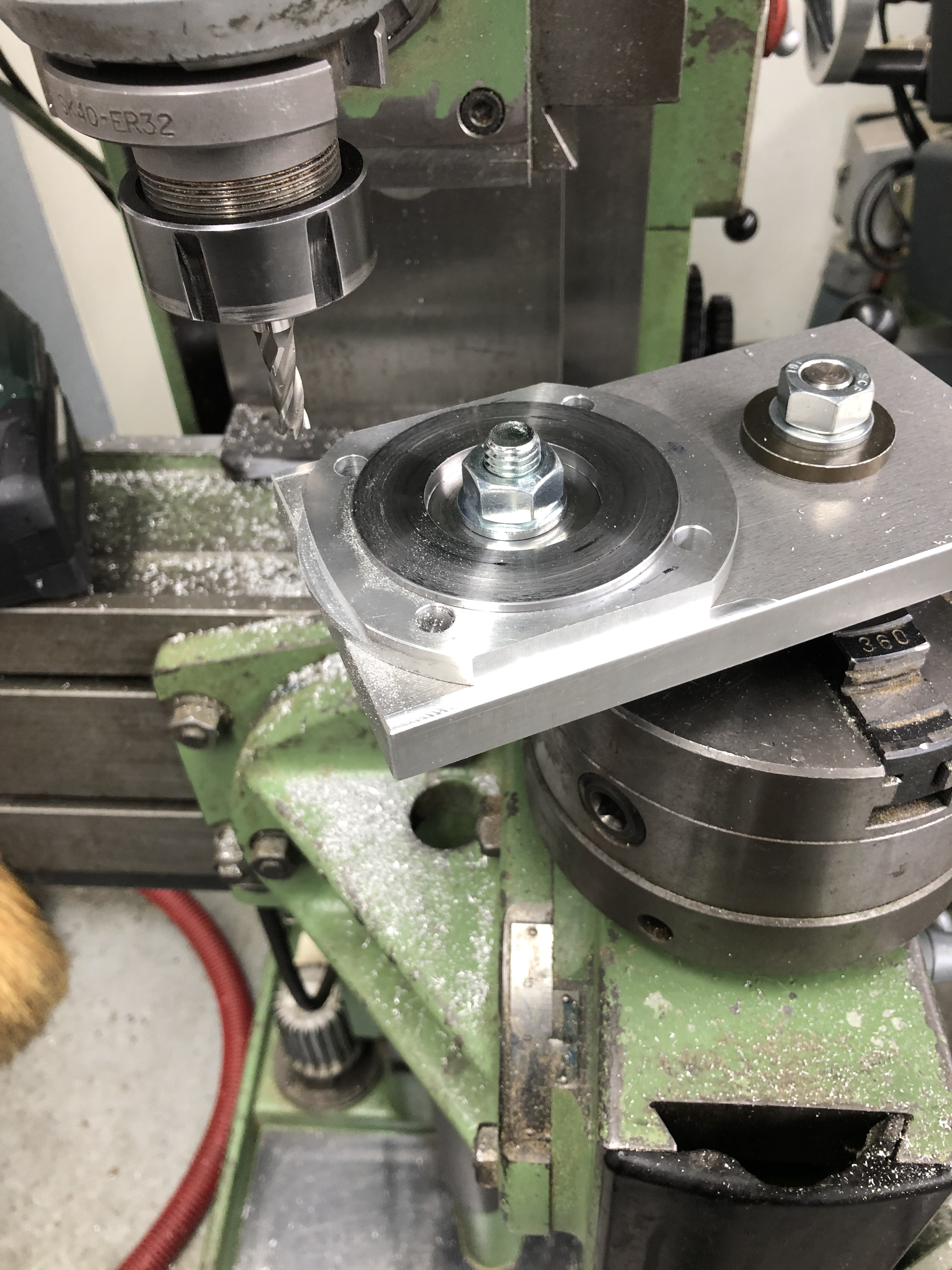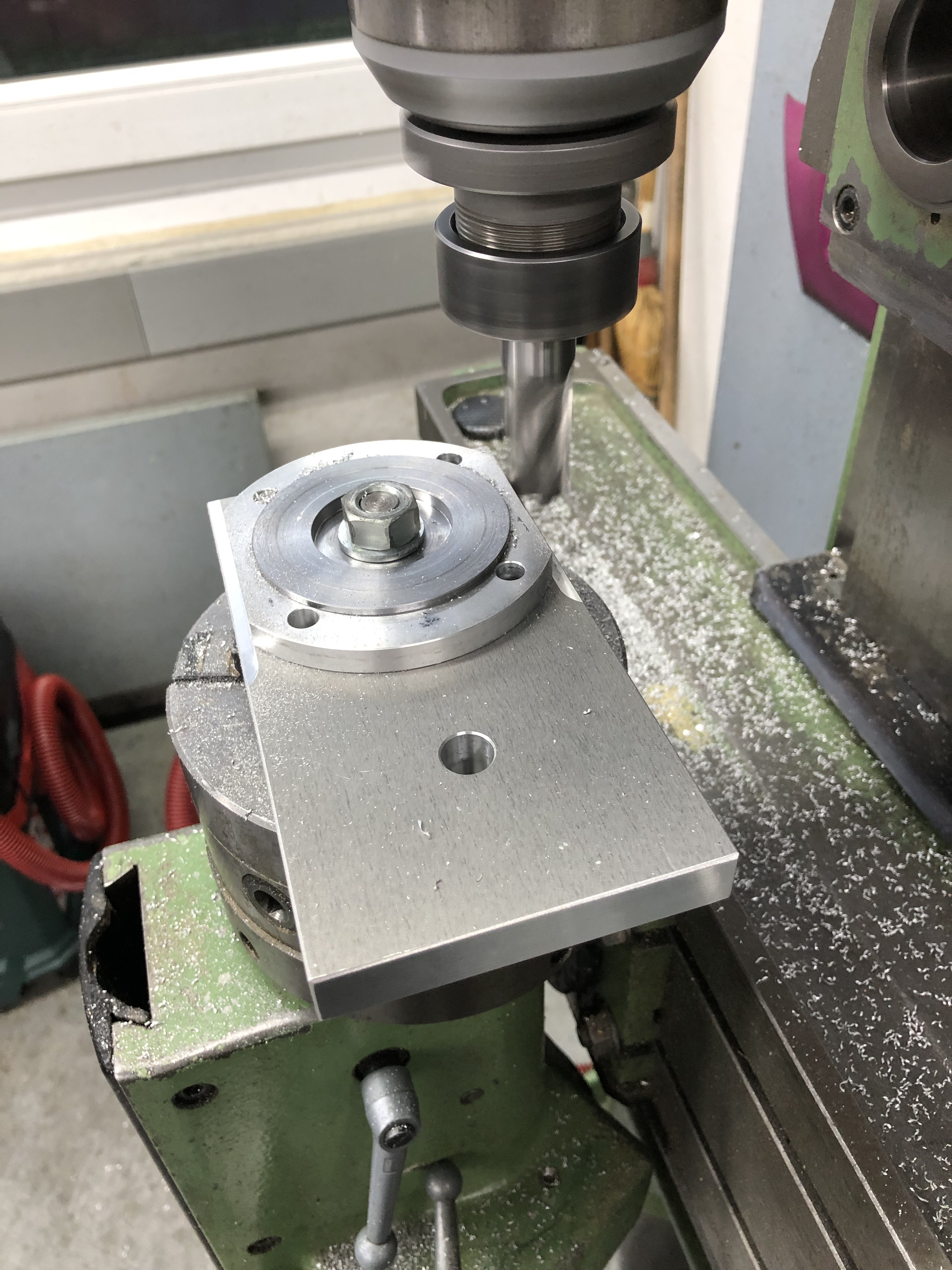 Da die Platte mehrere Löcher hat, mußte ich nur nur den Aufnahmedorn am Primärlager in eine andere Bohrung versetzen und eine neue reinmachen. Also Tisch wieder drauf und umarbeiten: