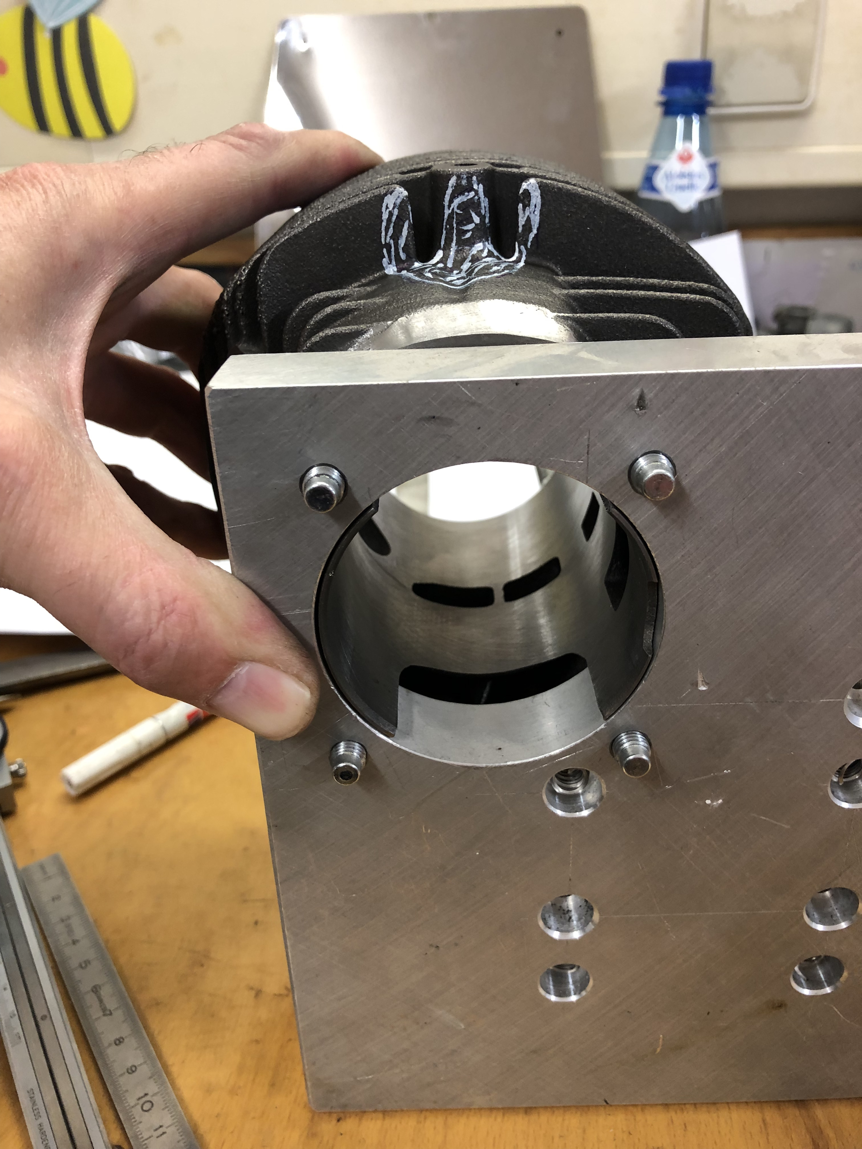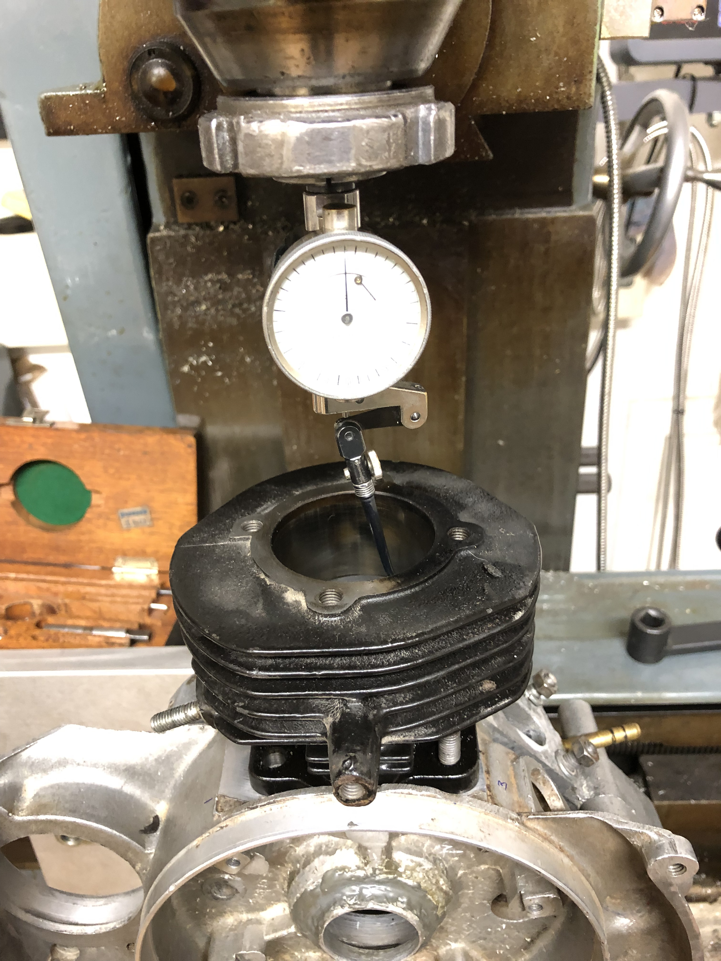 Ich hatte mal einen Ring, der genau in die Bohrung paßt, damit man den Durchmesser für die Zylinderachse auffangen kann. Den habe ich nicht mehr gefunden bei dem ganzen Zeug, also habe ich den DR 85 vom Lager geholt, mit dem die stufenweise Hubraumerweiterung der Ape mal begonnen hat und sein Hemd mit einer Lage Malerband beklebt.