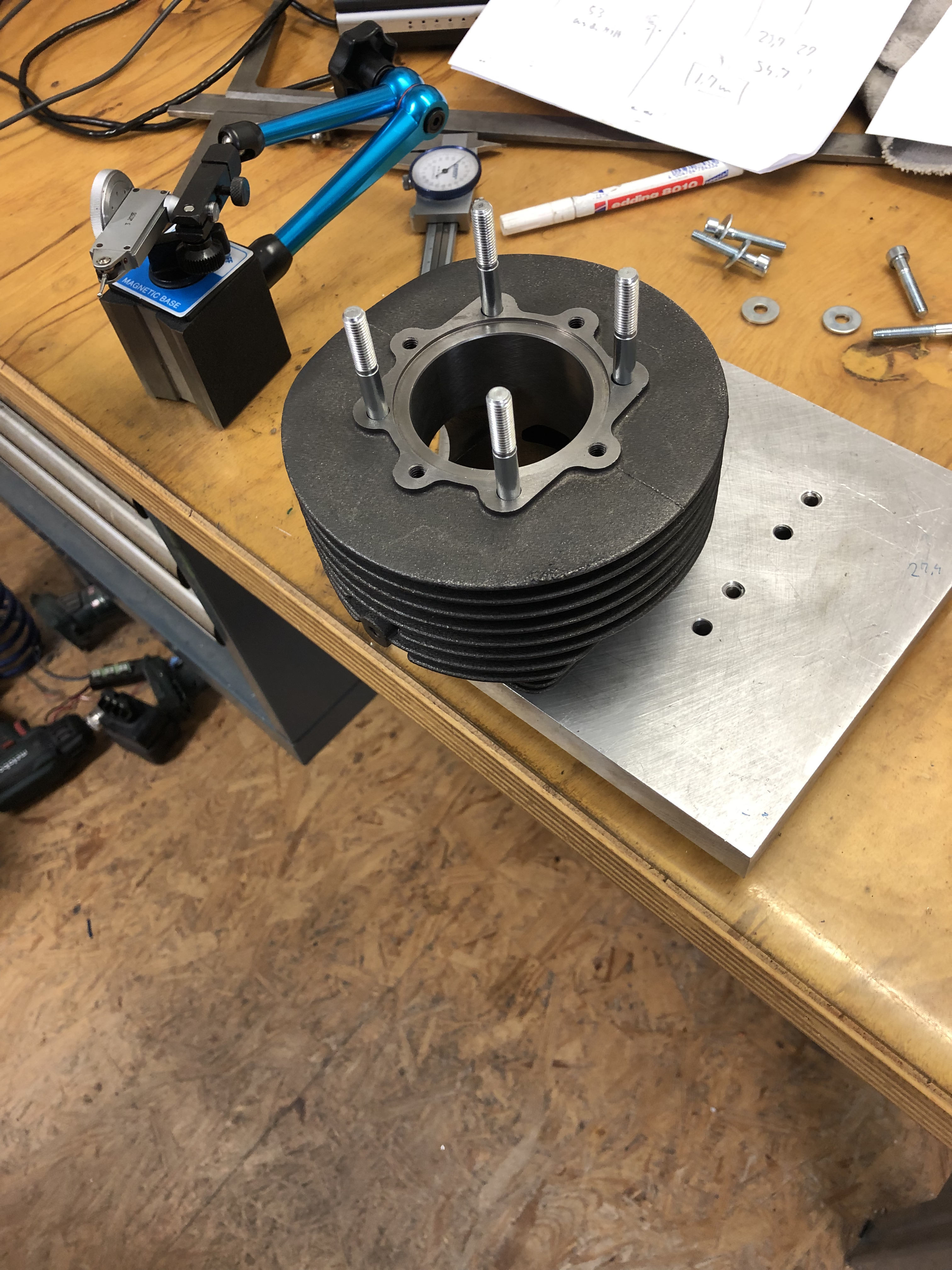 Die beiden Lüfterhauben und die Stehbolzen von SIP sind heute auch gekommen. Jetzt steht der Zylinder erstmal so an der Fräsmaschine.