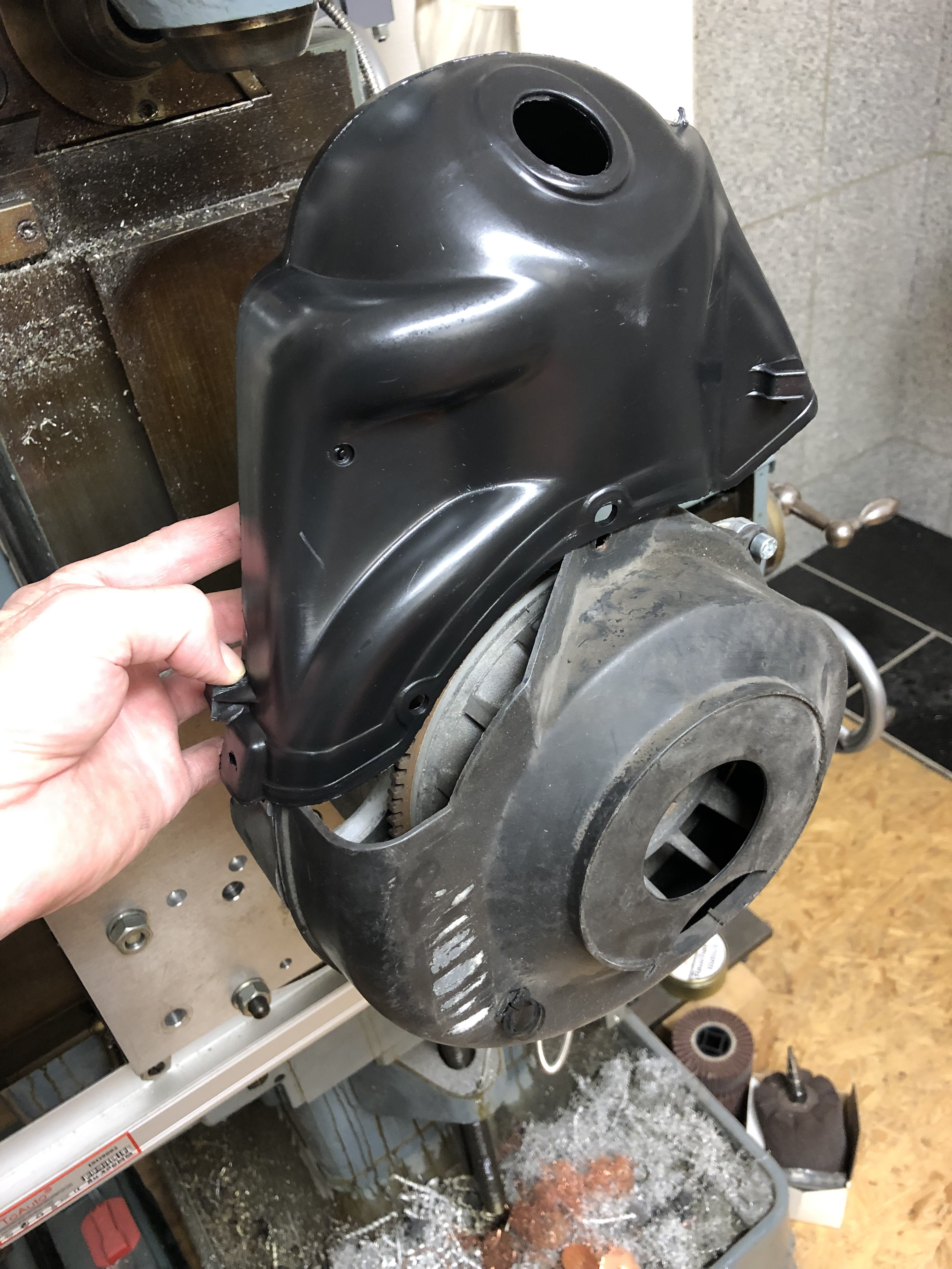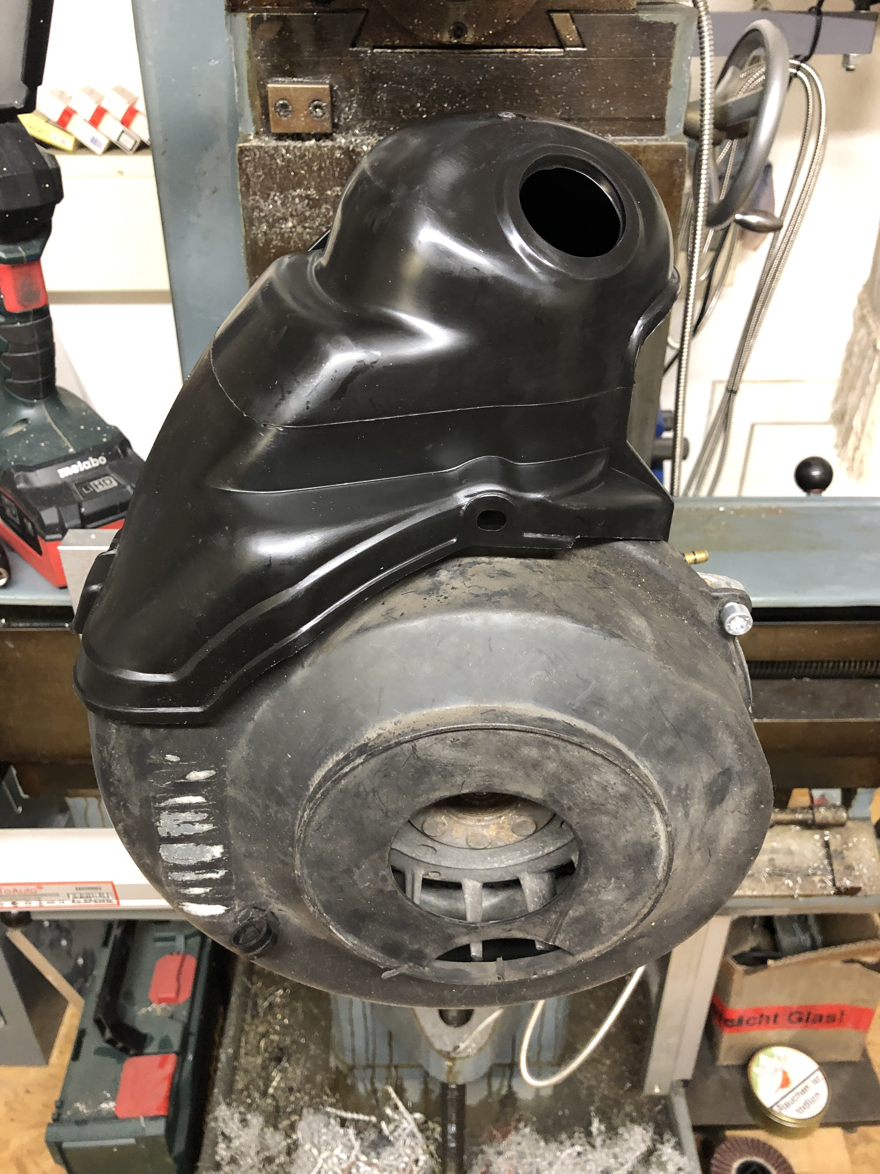 Jetzt noch die kleine Lüfterhaubenkunde für die Kollegen, die bei der Ape nicht so bewandert sind. Hier sieht man die Lüfterabdeckung eines moderneren Apemotors, wenn das Polrad mit den hohen Schaufeln verbaut ist: