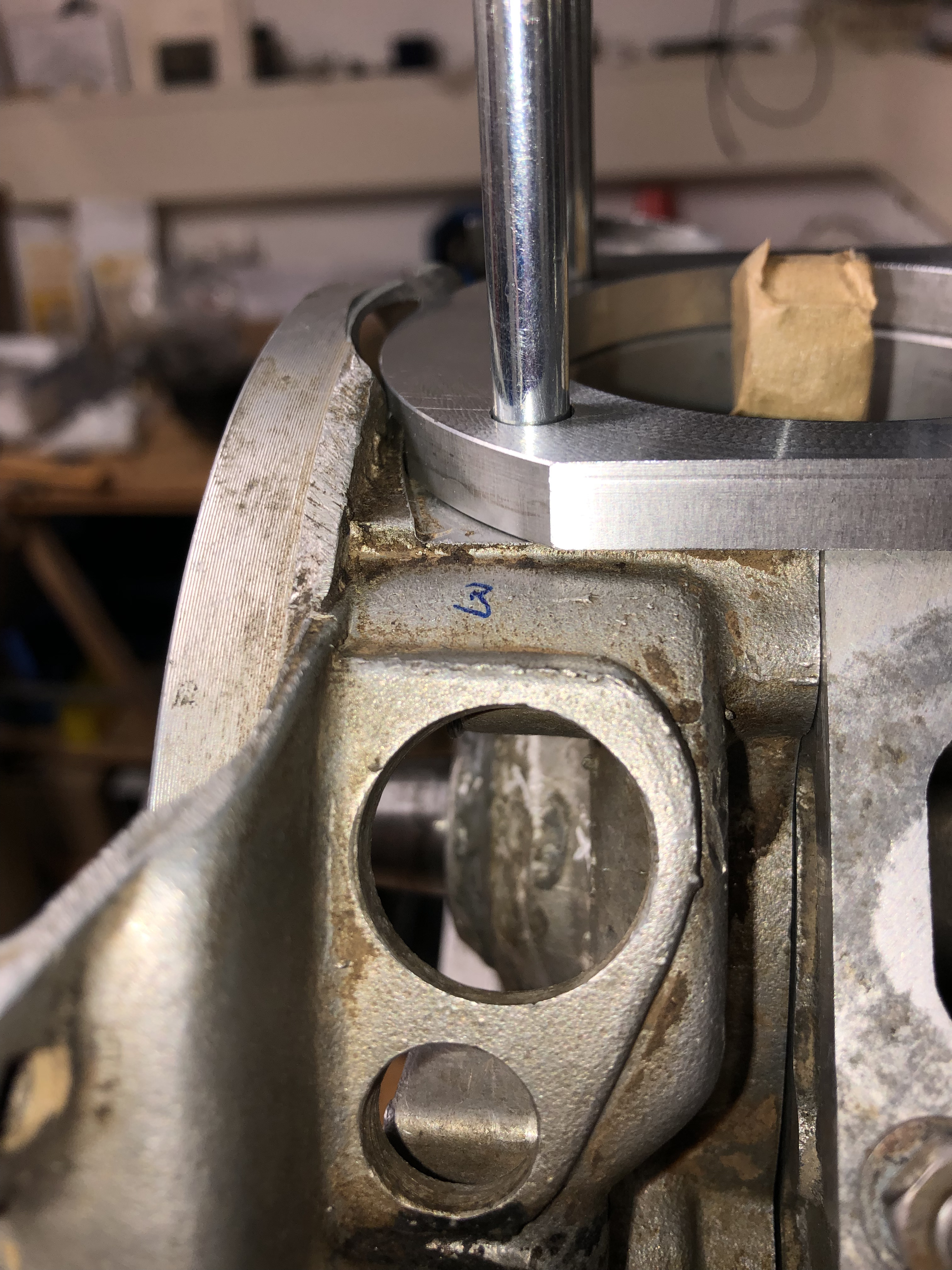 Dann saß er spielfrei im Gehäuse und ich hatte eine ununterbrochene Bohrung zum Auffangen. Im Gehäuse ist das ja nicht möglich, weil die Überströmertaschen den Durchmesser unterbrechen.