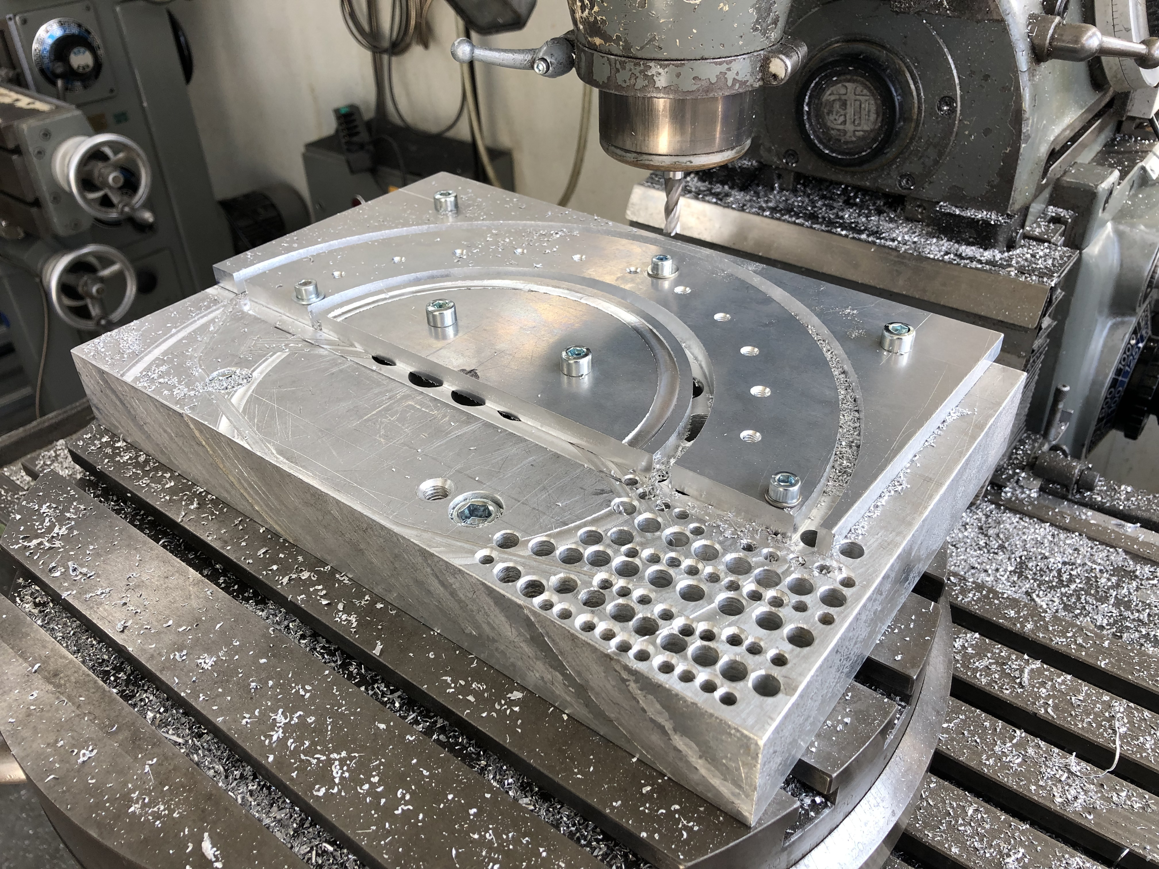 4 Millimeter quasi überall, plus/minus 2 Zehntel oder so, also ein bißchen geht. Die Vorrichtung für das Gehäuse abgenommen an der Maho und den Tisch wieder drauf nach dem Abendessen und mal 1,7 mm weggehobelt von der höchsten Stelle: