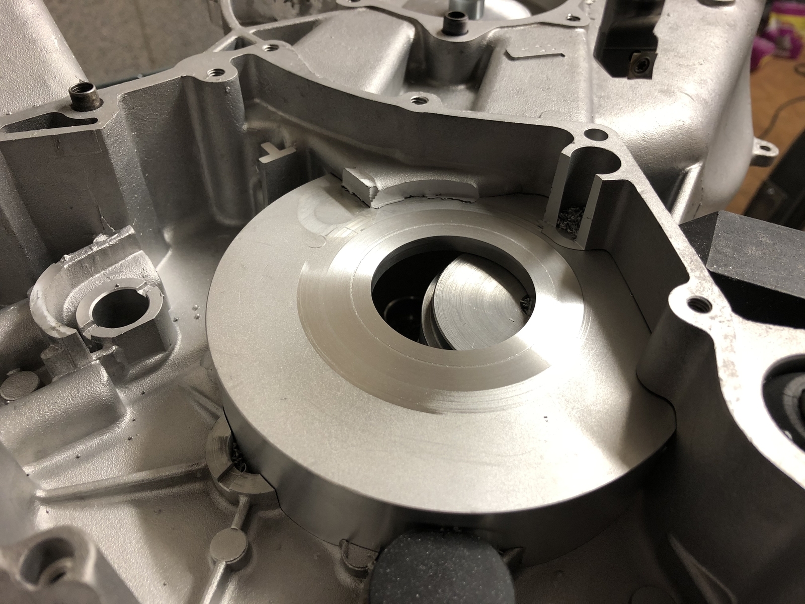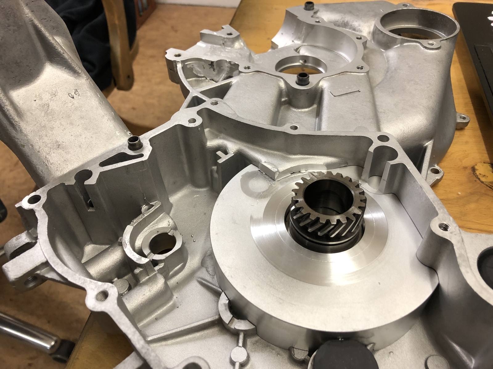 Dieser Flansch wird sich ja außerhalb des Getriebes befinden und dort muß die Kupplungsglocke, die im Vordergrund liegt, noch irgendwie angeflanscht werden.
