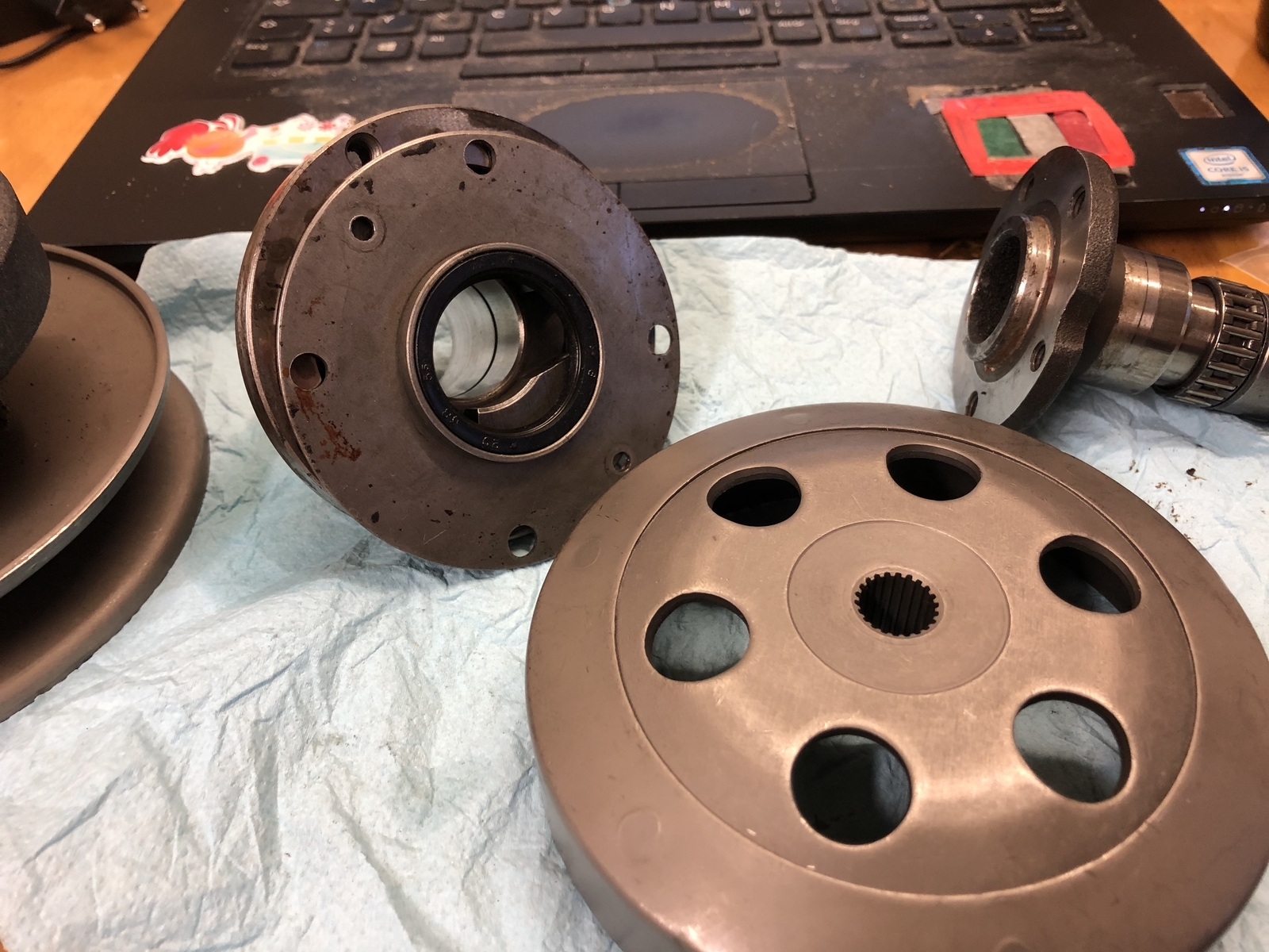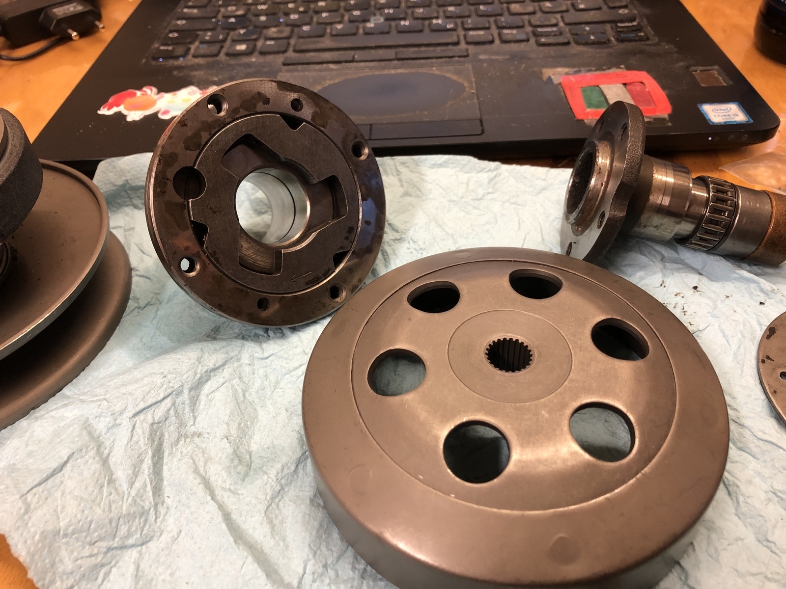 Gerade habe ich nochmal ein paar Teile aus den Kisten geholt, die im Original in das Getriebe gehören. Ganz konkret, die Teile, die neben dem Flansch am Eingangsrad mit seiner inneren Geometrie noch zu dem Freilauf gehören.