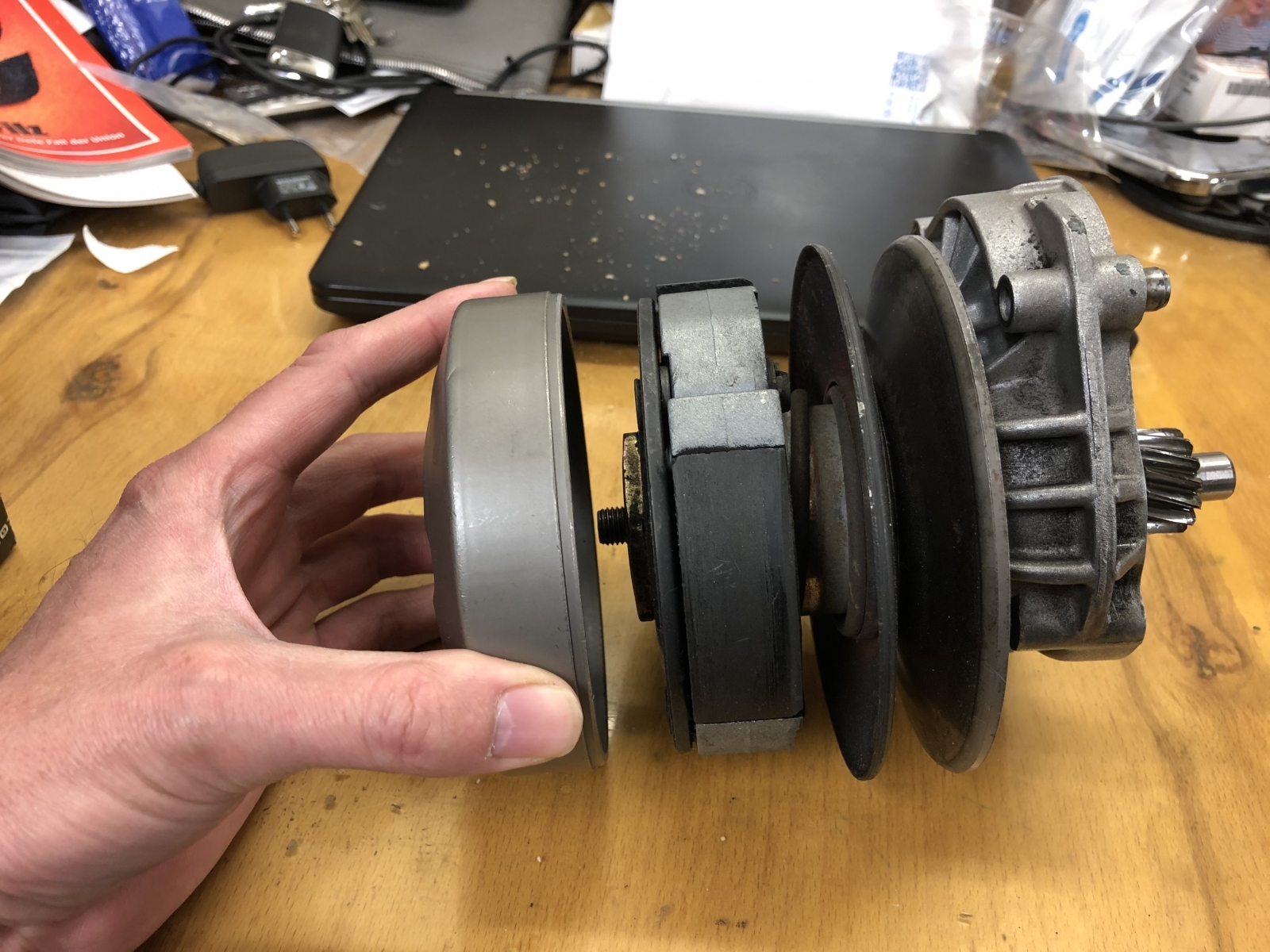 Und eben diese Gegendruckfeder könnte noch ein Problem werden, weil sie ein wichtiger Bestandteil der Abstimmung ist mit den Gewichten in der Malossi-Vario zusammen, wenn man meinen Traktormotor sinnvoll über den Riemen auf die Straße bringen will.