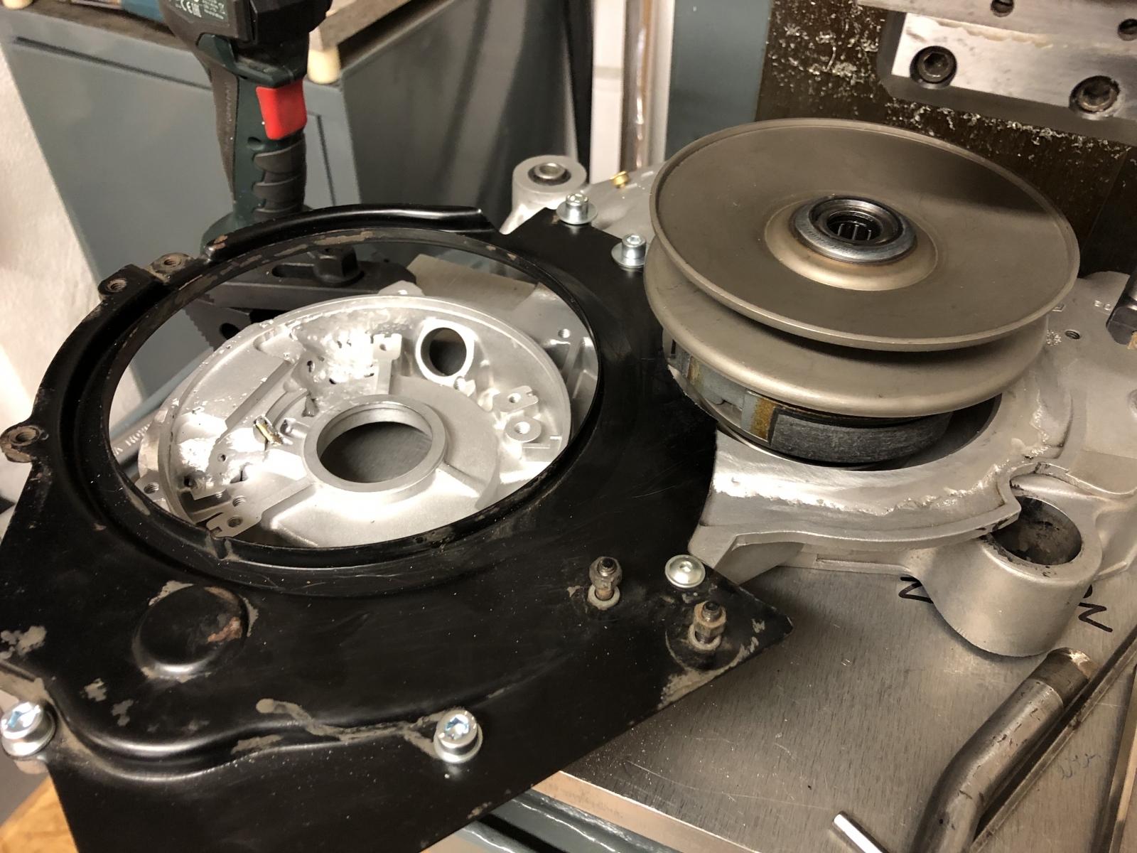 Ein weitere Preis neben der geringen Auswahl an Getriebeübersetzungen, den ich für diese Entscheidung zahlen muß, ist die etwas komplizierte Konstruktion mit dem Flansch, den ich zum Gegenhalten der frei drehbaren Wandlerwelle brauche. Bei einem Scooter und einem Wandler mit innerer Lagerung reicht es, wenn ich das Hinterrad festhalte. Das geht bei mir nicht mehr.