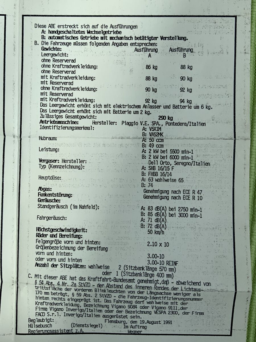 Hallo Christian, anbei die interessante Seite der Betriebserlaubnis einer VA52T aus 1993, PK50 XL2 Automatik mit Elestart ohne Kicker. Hier findest du die Angaben zur Hauptdüse und dem Vergaser. Viel Erfolg. Falls du mal so etwas wie ein Werkstatthandbuch hast, ich würde mich über eine Quelle oder Scan freuen.
