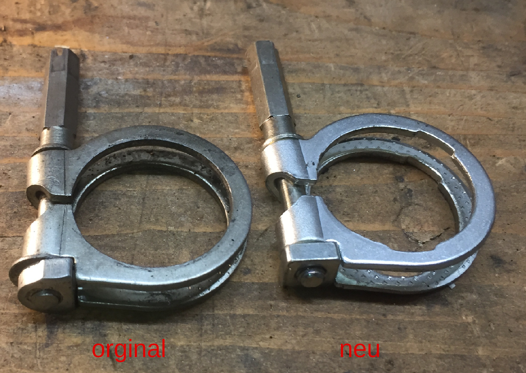 Bild 6 orginale Klemmschelle hat keine Ausklinkungen an ihrem Umfang ? Die Nachbauschelle fiehl gleich aus dem Rennen weil beim Anziehen die untere Mutter sich beim Anziehen der Schraube mitgedreht hat.