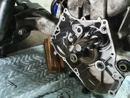 Beim Fahren sind unüberhörbare mahlende Geräusche aus dem Getriebe vernehmbar. Es war viel zu wenig Öl im Getriebe, das erstmal aufgefüllt wurde. Es wurde leider nicht besser. Hinterrad und Deckel demontiert. Das Getriebe ist sehr überschaubar. Das Vorlegezahnrad hat gehäuseseitig sehr viel Spiel. Ich vermute mal das Nadellager ist schrott. Leider kann ich das Zahnrad nicht rausziehen, Es wird blockiert durch die Sperrvorrichtung der Riemenscheibenwelle.