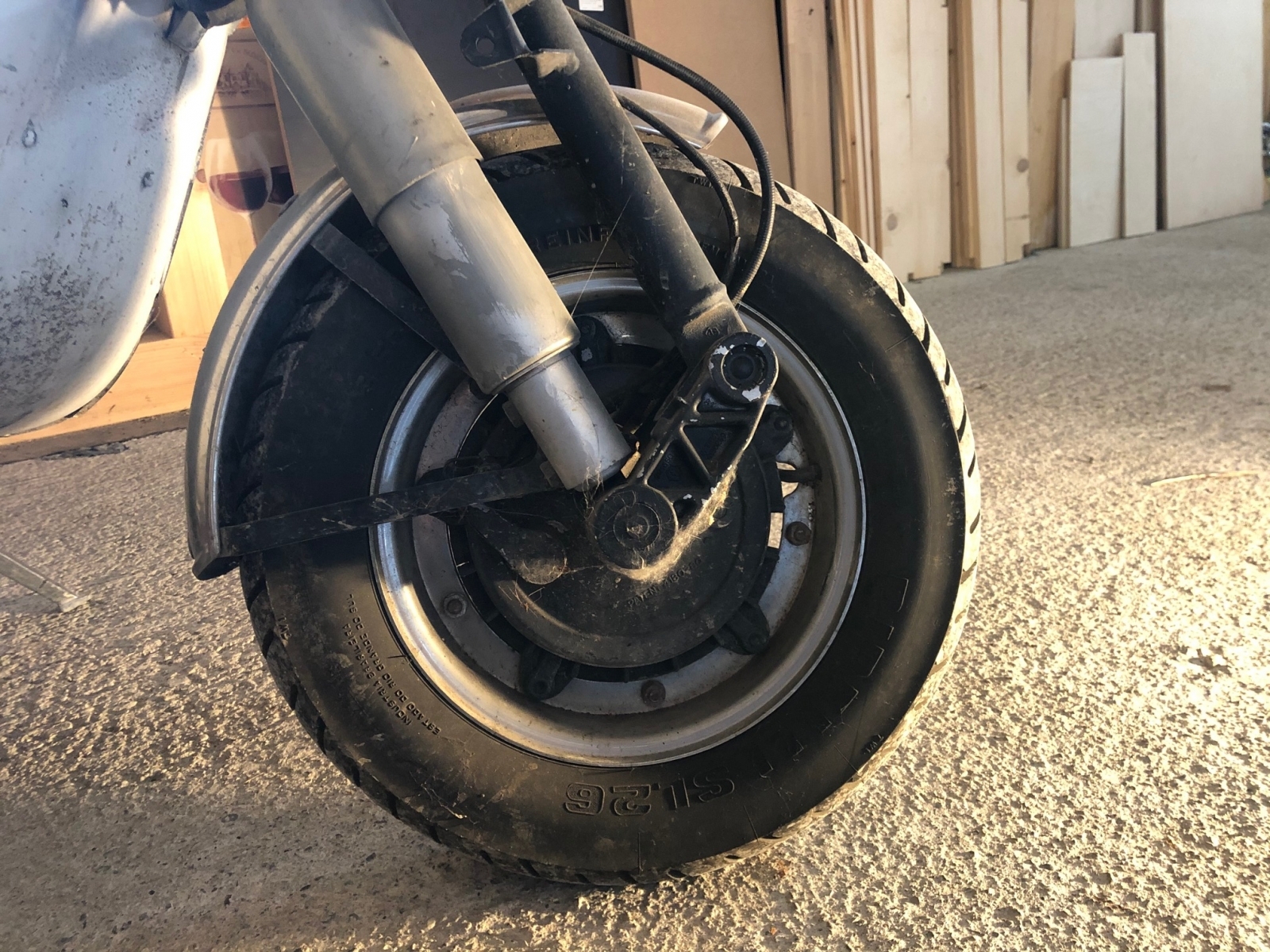 - Bild 5: Vorderrad bei ausgeklappter Hauptstütze (Schutzblech ist ein wenig verbogen)
