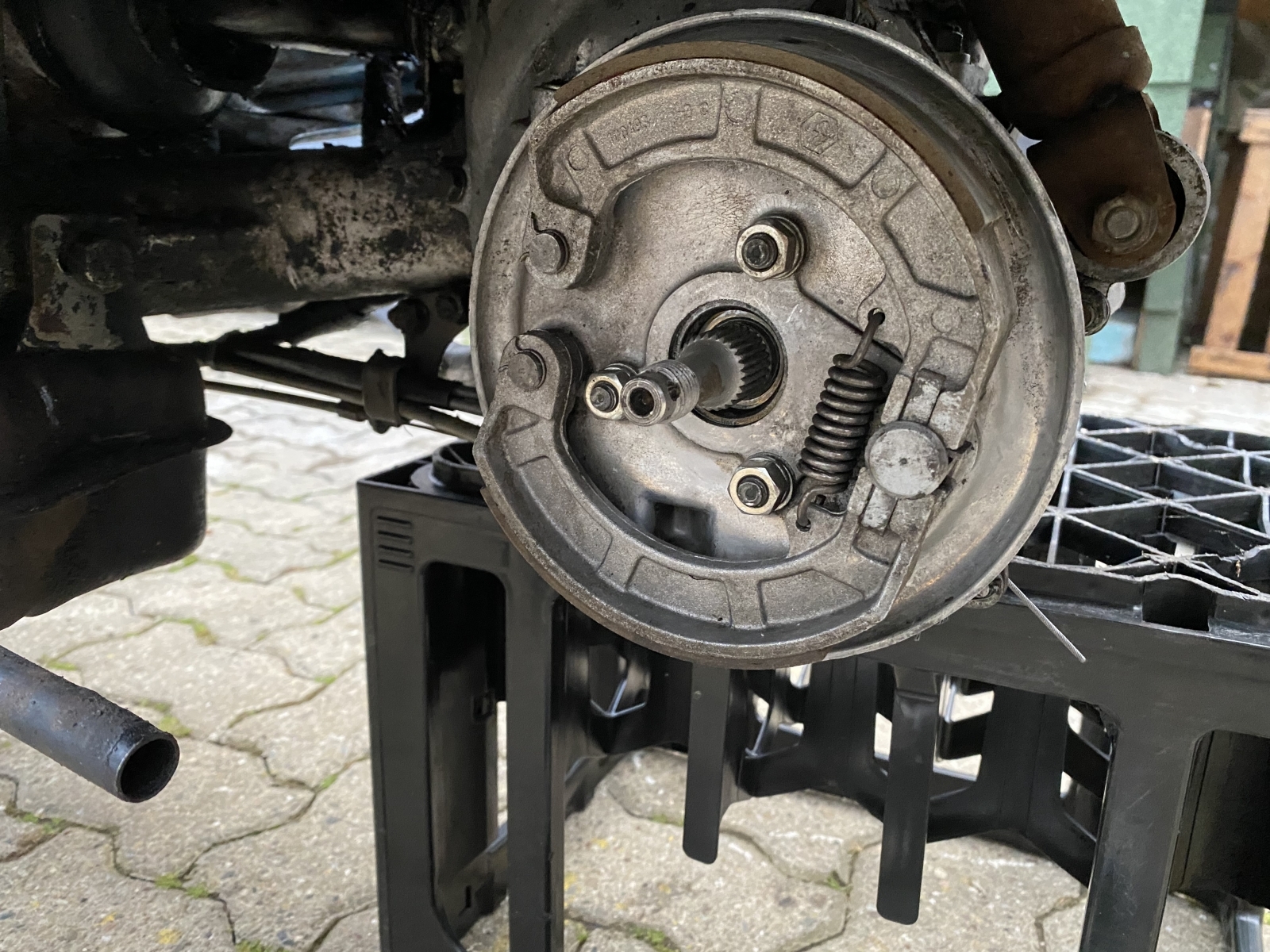 Da der Motor total verölt ist habe ich die Plastikabdekung vom Zylinder versucht abzunehmen und alles vorsichtig abgedampft. Dann mit einem Zitronenreiniger dass Öl gereinigt und dabei lief wohl etwas von der Siffe in die Trommel. Also Trommel raus gereinigt alles gut. Danach wollte ich die Schaltung einstellen. Vespa auf die linke Seite gekippt ohne Reifen und das ganze Getriebeöl lief aus.