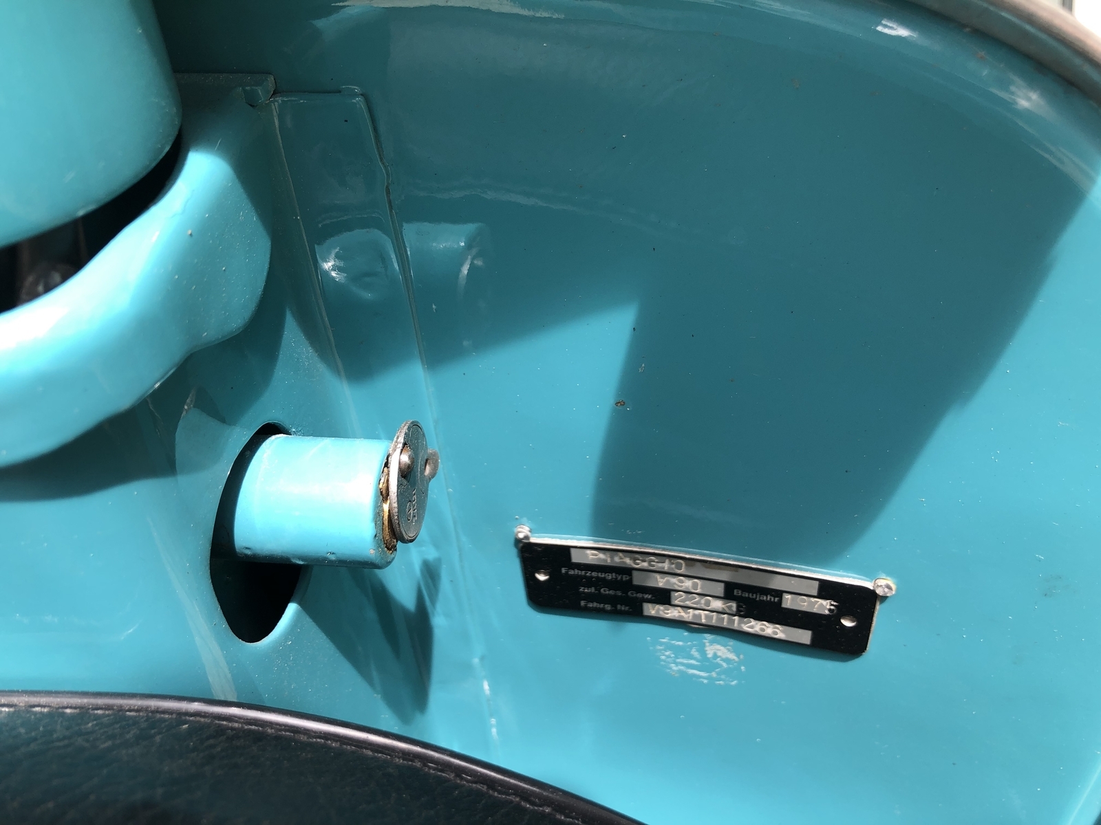 Hey! Vespa 90, hab ich auch noch nicht live gesehen. Hat wohl 90ccm und etwa 3 PS, fährt offiziell 65 Sachen. Die Angaben auf dem Typenschild passen, auch das Baujahr. wenn auch die Buchstaben und Zahlen leicht windschief sind…