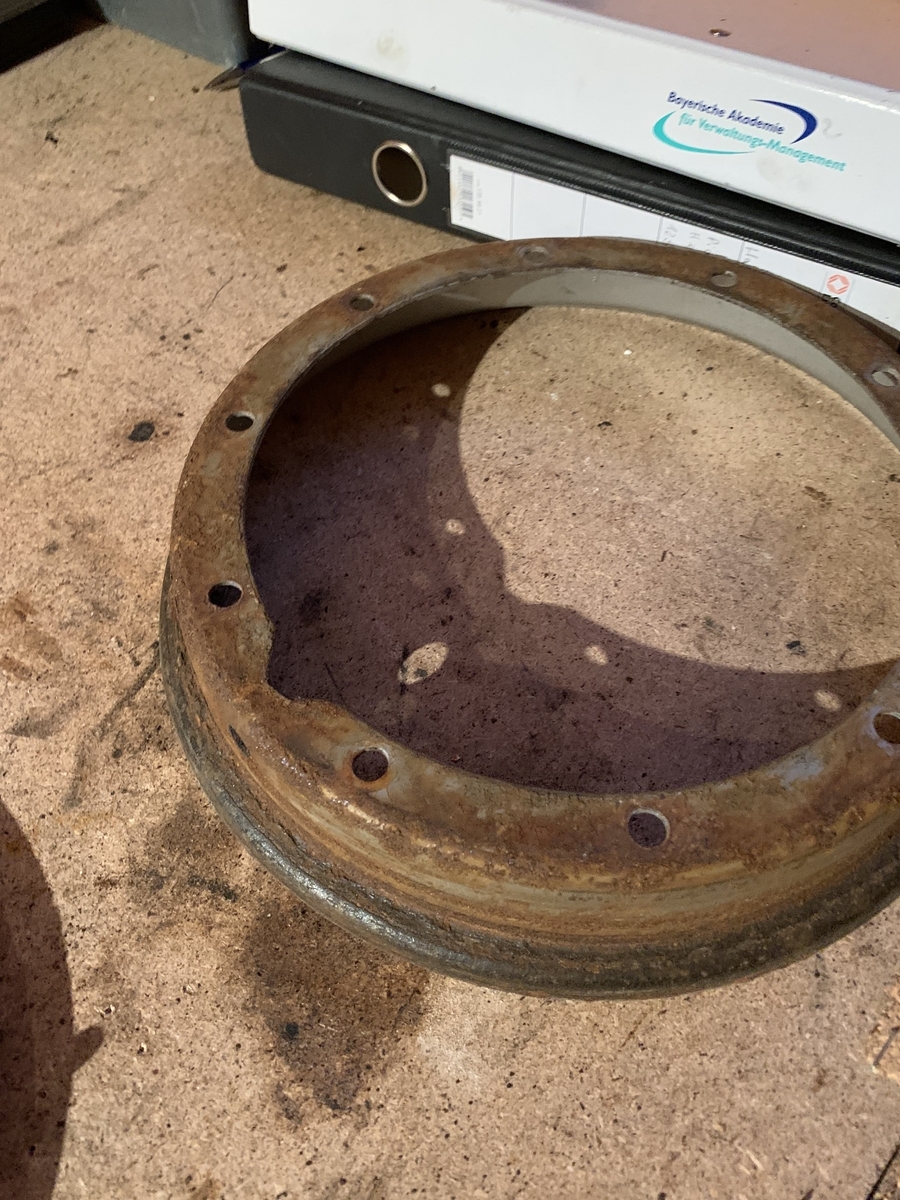 Auf Kleinanzeigen habe ich mir schließlich für 10€ zwei original Felgen geholt. Komplett eingerostet. Dann ging zuerst los mit Drahtbürste und Akkuschrauber (wird schon so auch gehen, dachte ich mir ;-)).