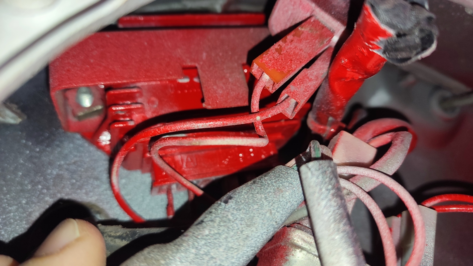 Ich habe unter dem rechten Seitendeckel ein abgezwicktes Kabel welches 2 schraze Kabel enhält entdeckt. siehe kleiner roter Kreis.