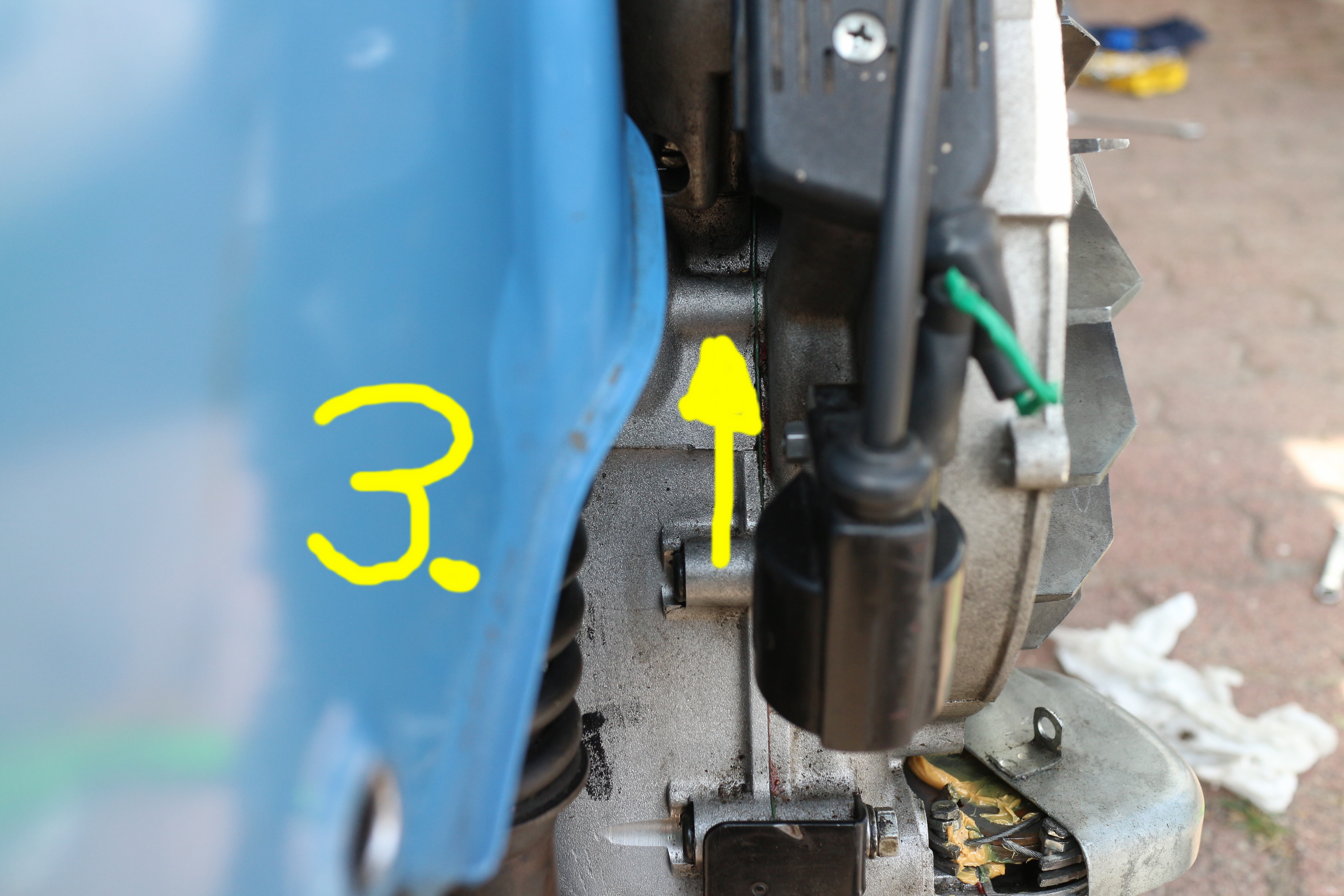 Auf dem Motorgehäuse gibt es eine Markierung (blauer Pfeil) und eine auf der Grundplatte der Zündung (gelber Pfeil).