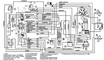 Das Schwarze (Grafik: Rot-Schwarz) und das Blaue von der Zündung gehen zu der Zündspule. Dort werden die beiden jeweils an einem der 2 Pins zusammen mit dem Grünen bzw. Schwarzen des Kabelbaums verbunden. Das Gelbe (Grafik: Gelb-Weiss) der Zündung wird direkt mit dem Blauen des Baumes verbunden.