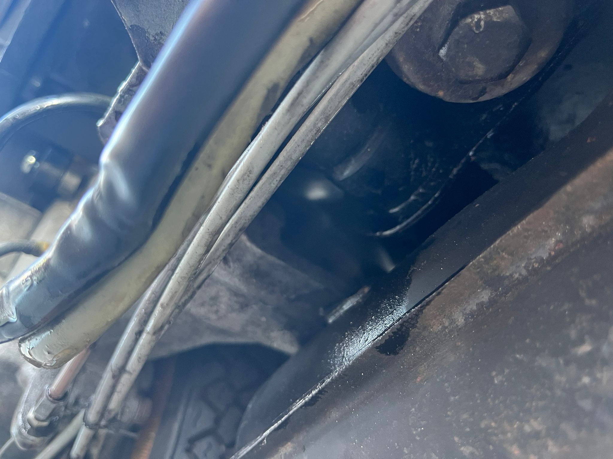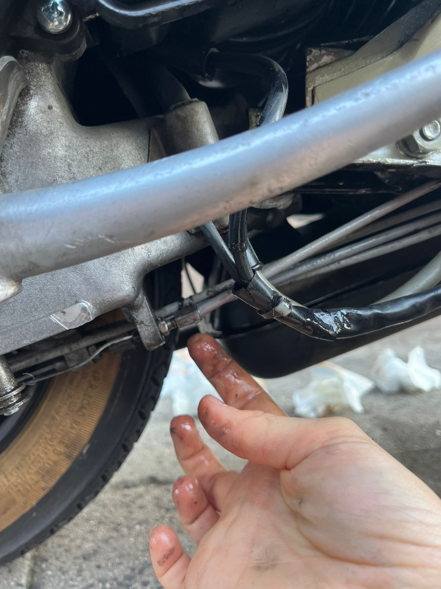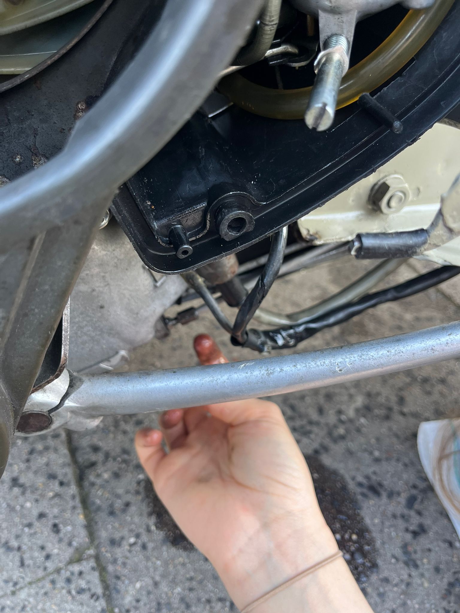 So weit, so gut. Der Verkäufer meinte bereits, dass das Zweitaktöl ein wenig austritt. Nun stand sie eine Nacht bei mir und hat schon ziemlich Öl getropft. Es sammelte sich vermehrt auf den Trittleisten und in allen Ecken und Kanten, tropfte dann letztendlich auf der rechten Seite mittig ab.