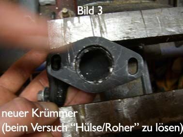 Bild3 zeigt den bearbeiteten "neuen" Krümmer und wie man vielleicht erkennen kann, hätte sich durch weiteres drauf rumschlagen, das (einzige) Rohr von der angepunkteten Befestigungshalterung gelöst und wäre schrottreif gewesen.