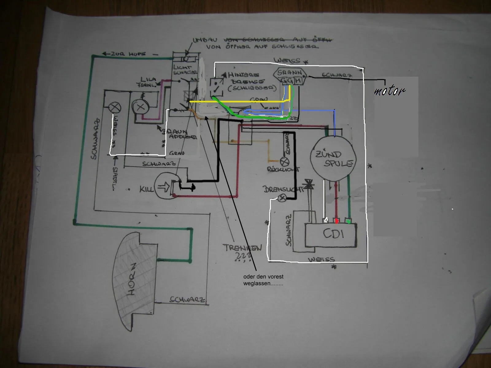dieses dann an den hupengleichrichter und die beiden grün/schwarzen an die hupe.das grüne von der zgp ist nur für die zündung zuständig und hat nix mit den verbrauchern zu tun.