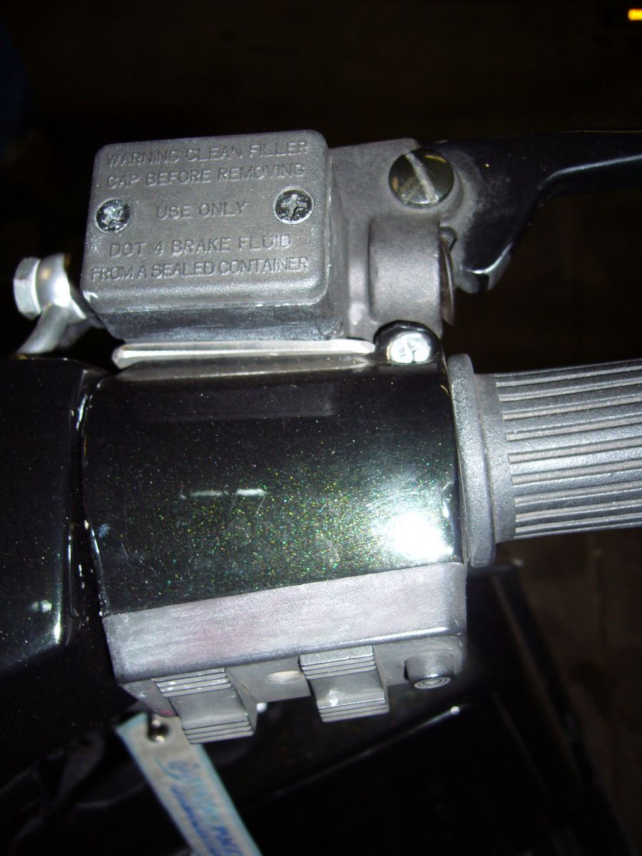 - und die Schraube, an der normalerweise Dein Hebel befestigt wird.Wie man bei der Elbratte sieht, ist die Aufnahme der AJP-Bremspumpe anders. Diese wird um das starre (Polini?) Gasrohr geklemmt. Dementsprechend brauchst Du größere Ausschnitte im Lenkkopf und der Abdeckung und einen Schnellgasgriff, da Dein Gasrohr ja jetzt nicht mehr zu bewegen ist...