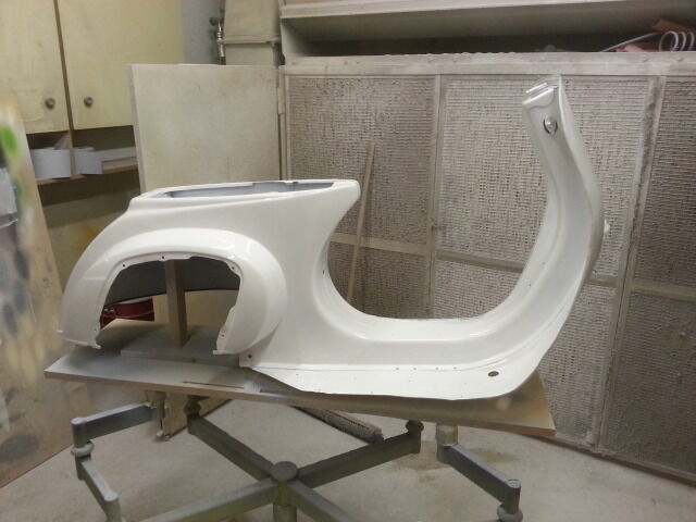 ja ist jetz schon paar jährchen her dass ich das damals angefangen habe, die vespa wurde dann kurz danach sand gestrahlt und dann habe ich mich nicht mit meinem bruder (dem sie auch zur hälfte gehört) auf die farbe einigen können, und so sind jetzt mittlerweile fast 6 jahre ins land gegangen, wie doch die zeit vergeht. jetzt allerdings habe ichs einfach mal durchgezogen, bin lack kaufen gefahren und hab den ganzen krempel mal wieder rausgeräumt. gearbeitet wurde mit produkten von mipa und der farbton ist ral 9003 signalweiß. gearbeitet wurde in meiner schreinerei und lackiert im zugehörigen lackierraum, ist leider für fahrzeuglackierung nicht perfekt geeignet da es drinnen etwas zu staubig ist und wegen -5°c außen konnte ich auch nicht die absaugung nutzen, aber immerhin gute pistolen