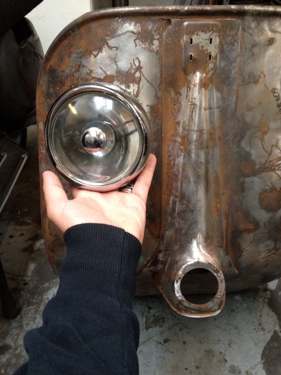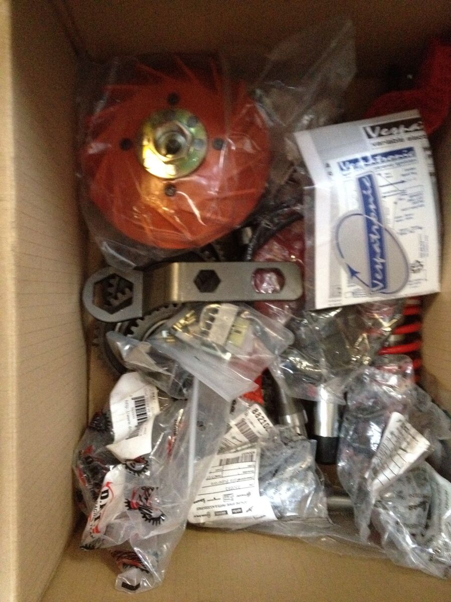 Ich habe in der Zwischenzeit die ersten Sachen zusammen getragen: Bitubo hinten, flammneues 200er Getriebe, DRT Tannenbaum, Vespatronic, Lagersatz, und neue Steuerlager. Über Ebay UK kam noch dieser schöne Scheinwerfer, dazu und aus Pathologie meiner Werkstatt habe ich noch ein PX Lenkrohr rausgeschnitten.