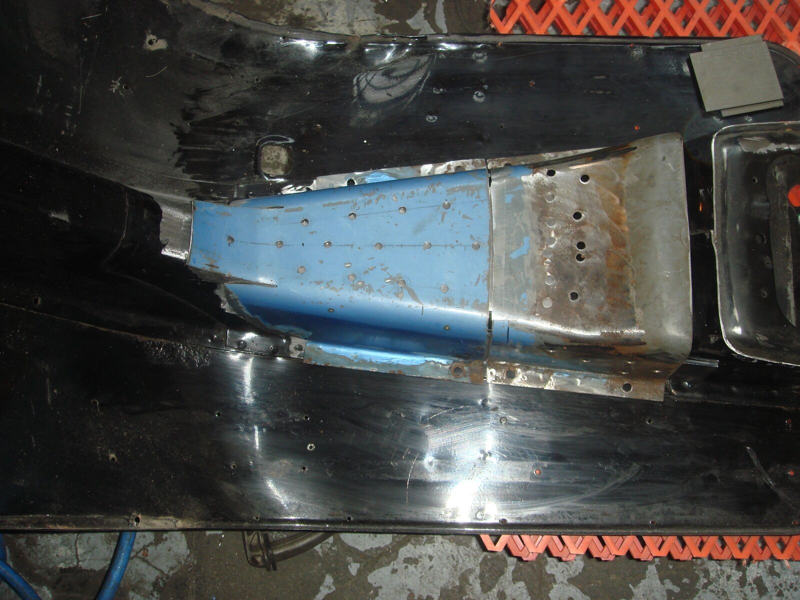 Die Karre wird ein Oldie Fake. Das Heck mache ich noch rund Es wird ein Repro Sprint lenker montiert und das Handschuhfach geht zum Teufel. Die Löcher für die Blinker werden zugeschweisst. Unter das Bodenblech sollen die Kühler und die Federung. Da ist für den Tank kein Platz. Der Tank kann nur noch unter die Motorbacke. -