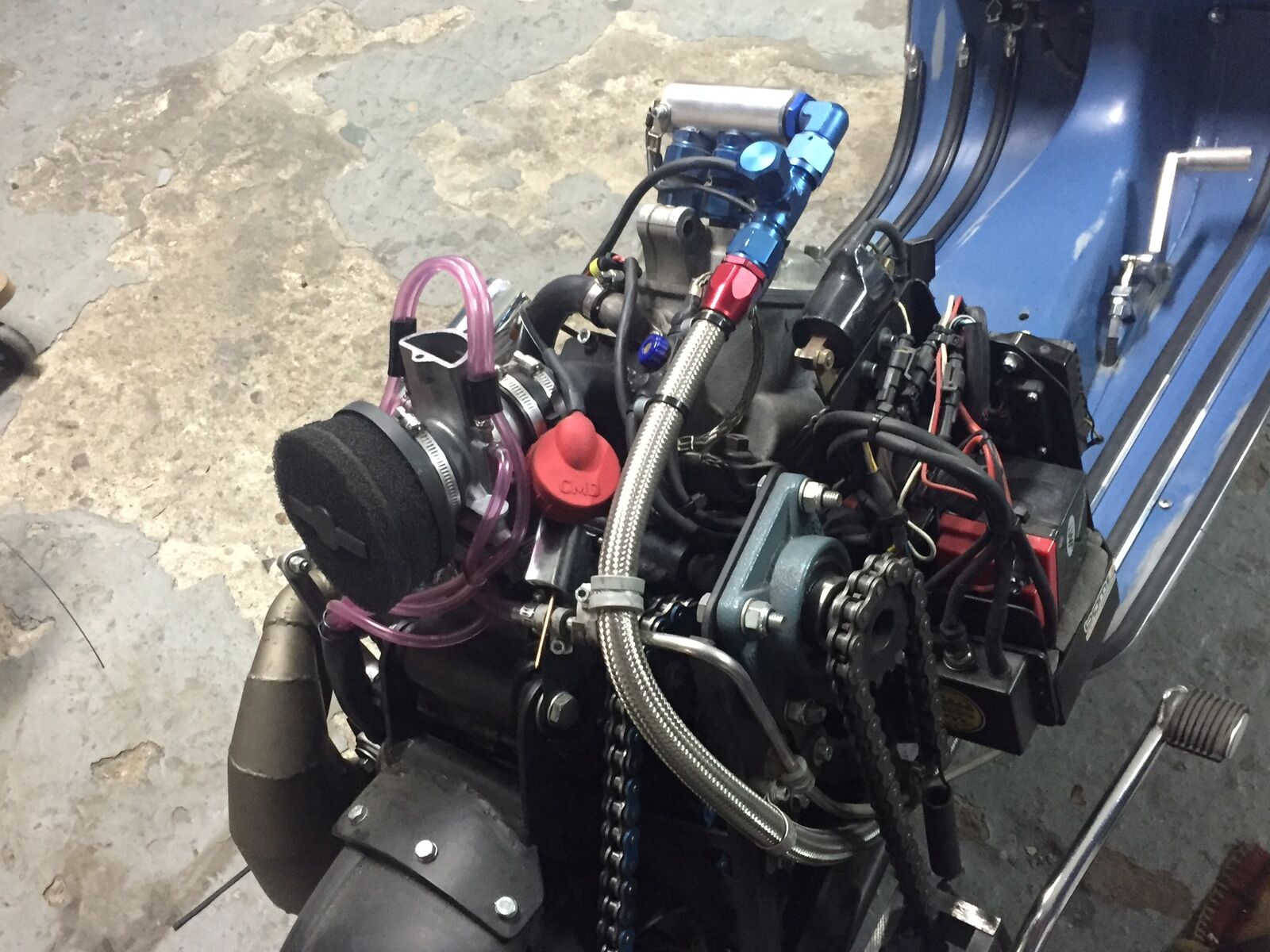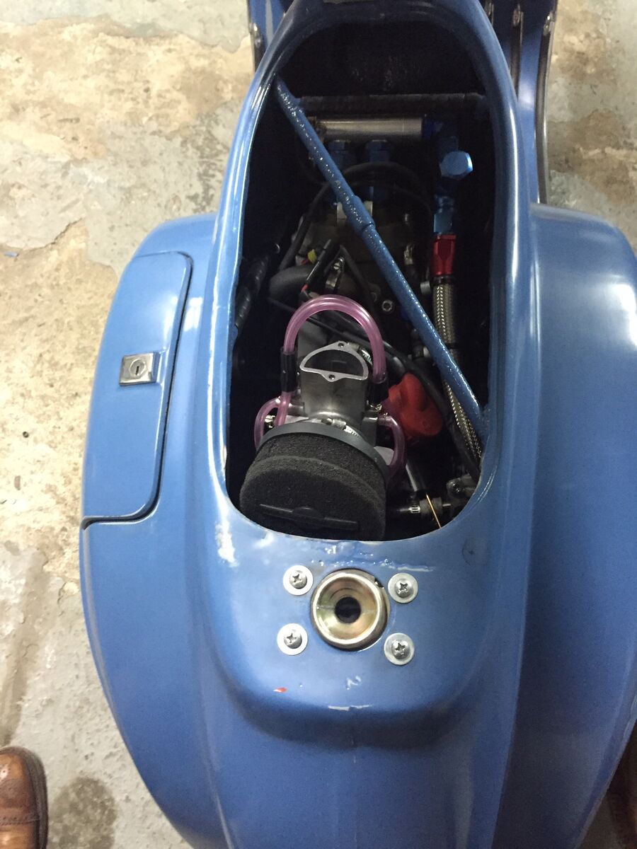 Einen Luftfilter bringe ich aus Platzgünden direkt am Vergaser nicht unter. Eine Airbox wäre toll, aber auch hier limitiert der Platz die Idee. So sieht die Lösung für den Luftfilter im Moment aus. Ich hoffe, dass der Schlauch mir nicht zu viel Leistung nimmt. Wir werden sehen... Erstaunlich ist, wie mager ich den Vergaser bedüsen muss. Aktuell bin ich bei einer 140er HD. Der Vergaser war vorher mit einer 142er HD auf einem 220er Malossi unterwegs.