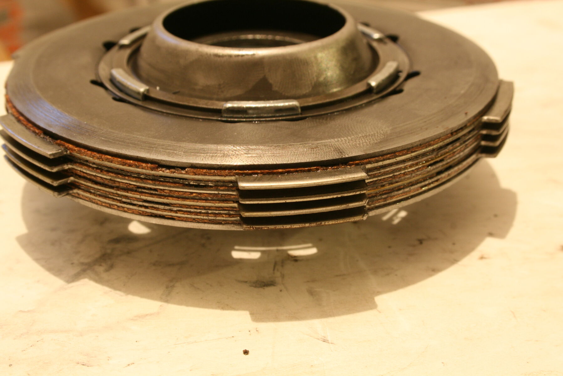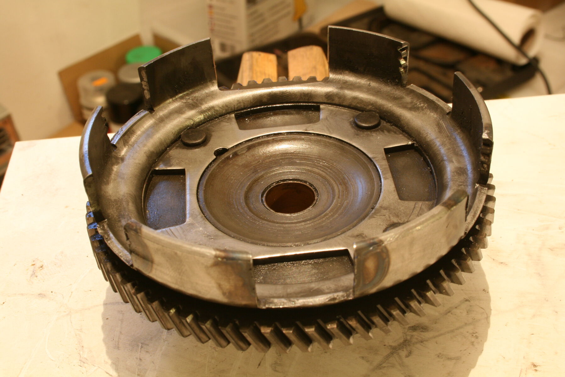 Anbei die Fotos meines ausgebauten Primärkorbs - Mir machen diese Kerben etwas sorgen und deshalb frag ich mal nach, ob die noch im grünen Bereich sind. Außerdem finde ich die Kupplung etwas mysteriös. Das ist nicht wirklich die XL2-Kupplung, die eigentlich verbaut hätte sein sollen, oder? Meine letzte Frage betrifft die Schaltklaue: Ist die noch in Ordnung?