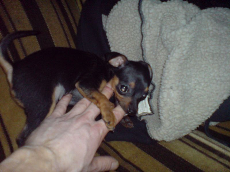 Hund heißt Lilly ist 11 wochen alt und fällt alles an was rumsteht..Muss immer aufpassen das niemand drauftritt..der is mega mini..Aber gefährlich wie ein rottweiler