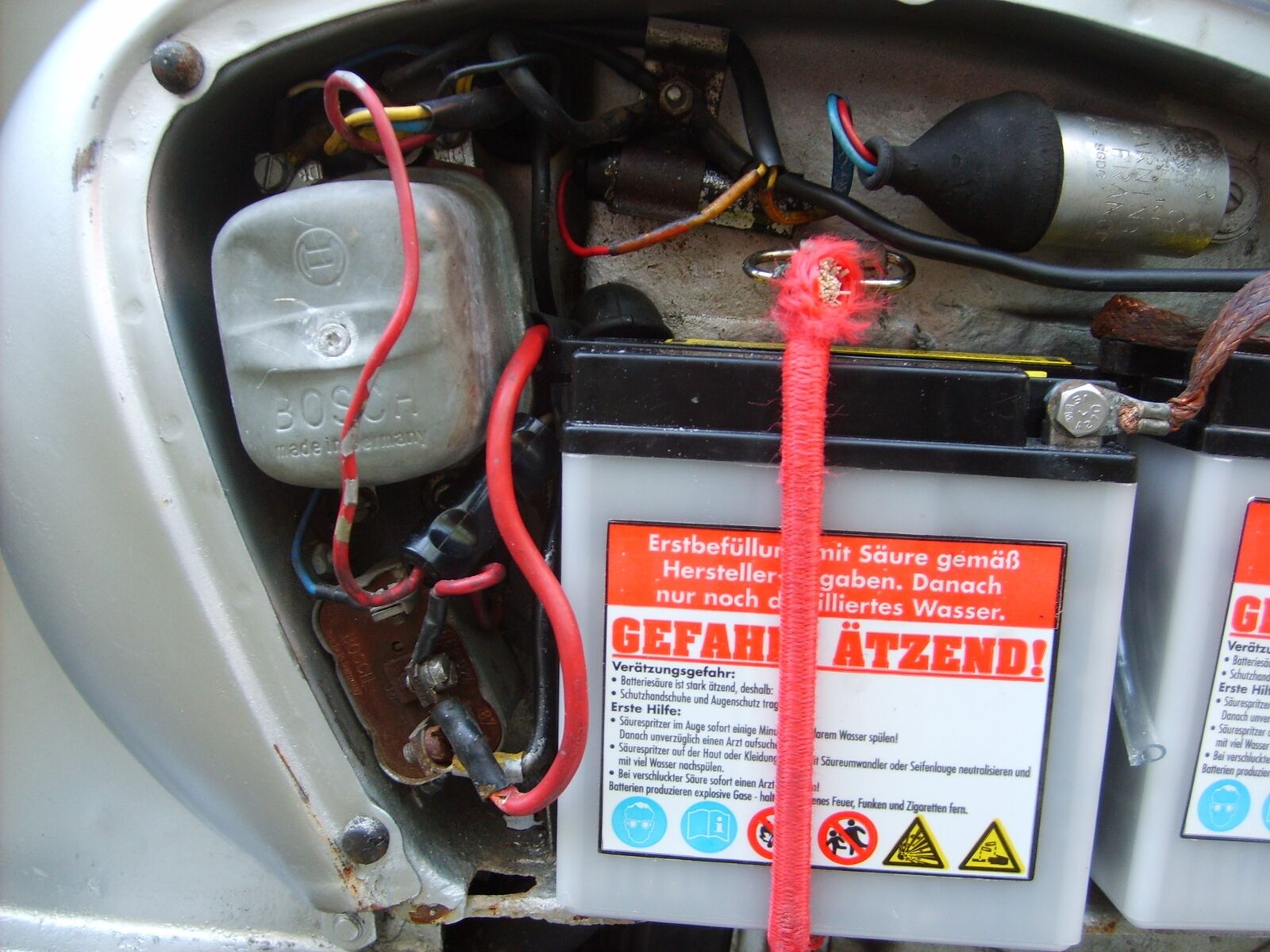 Als ich am Wochende nach dem Zylinderumbau an meiner 50n elestart noch das vordere Licht reparieren wollte ging auf einmal gar nichts mehr. Ich hab dann die Batterien an das Batterieladegerät für ein paar Stunden angesteckt, um zu sehen, ob es an den Batterien liegt. Dem war aber nicht so.