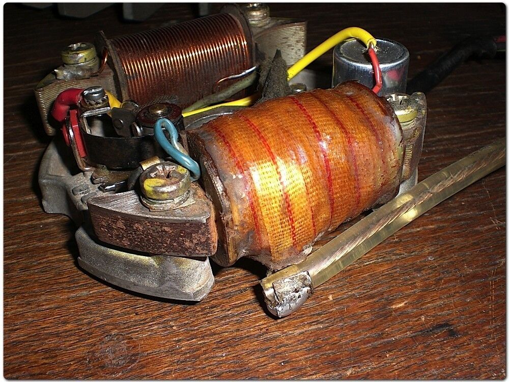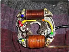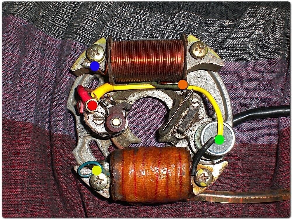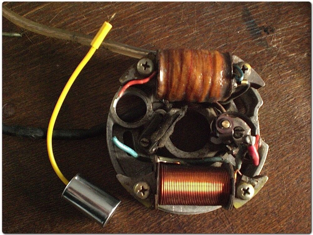 Langsam wird mir einiges Klarer. Die "obere" Spule erzeugt also den Verbraucherstrom, der für Licht und Hupe benötigt wird. Die "untere" Spule erzeugt lediglich den Zündfunkenstrom, und alle weiteren Anschlüsse an dieser Spule sind für die Unterbrecherfunktion am Lenker, damit man die Vespa auch wieder aus bekommt.