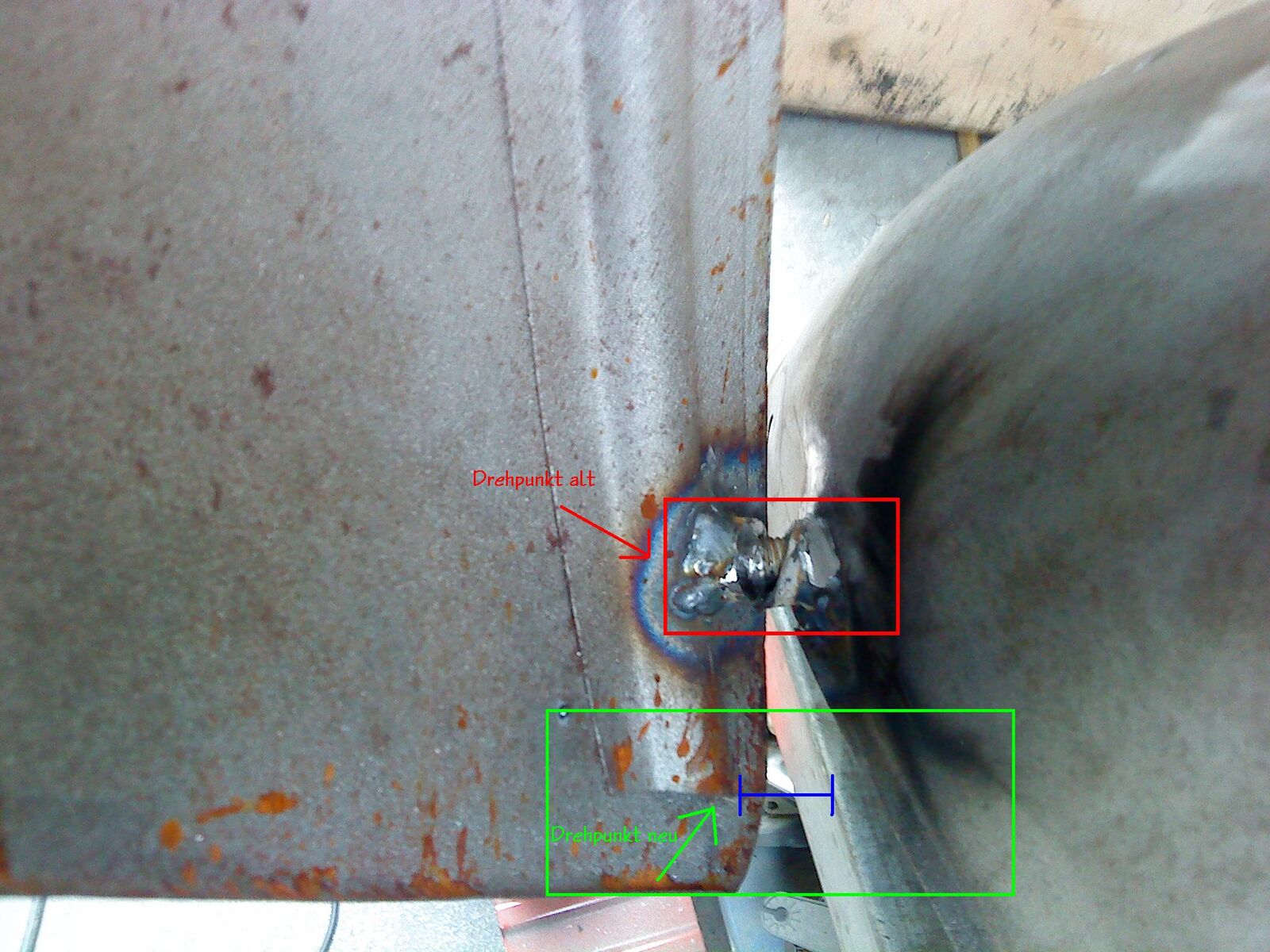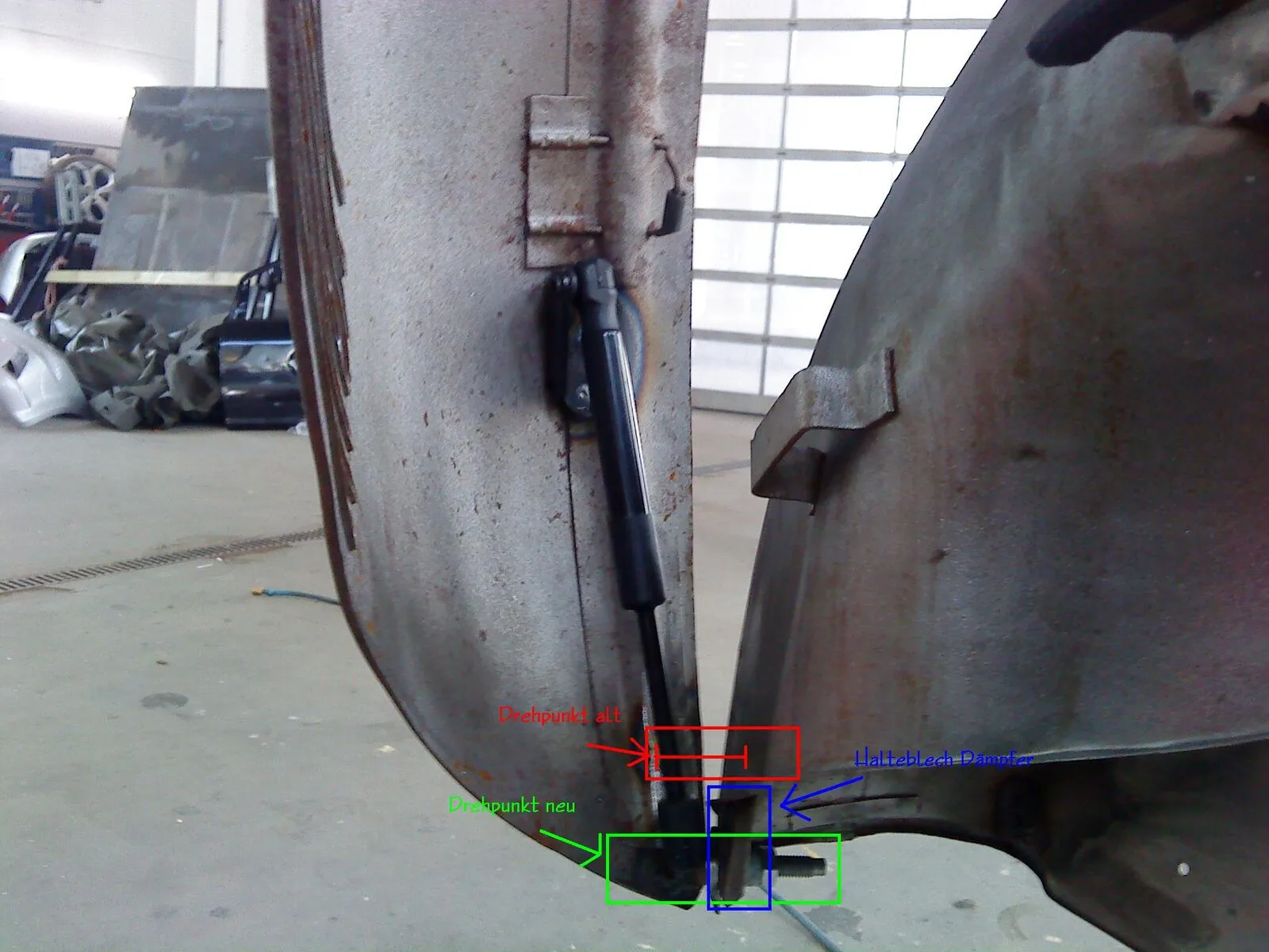 hier sieht man schön dass ich für den Halter an der karosserie ein Blech angefertigt hab, und kekanntet, dann verschweisst, aber zuerst dämpfer und Drehpunkt duchprobieren