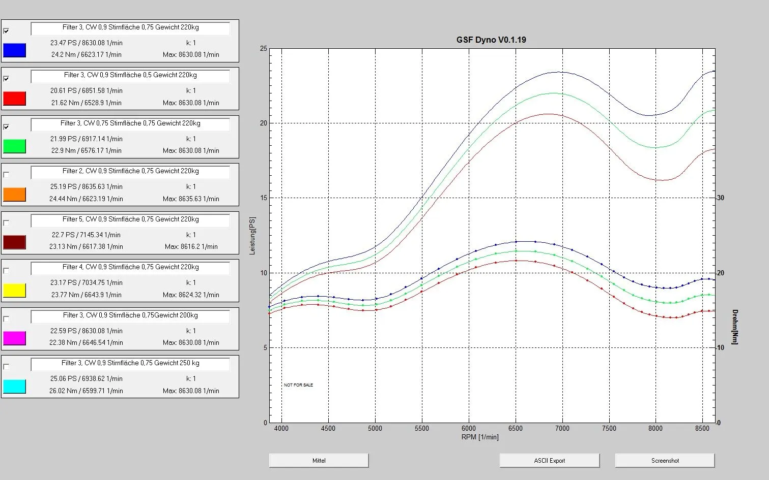 Setzt man den CW Wert oder die Stirnfläche um 0,25 nach unten ergibt sich ein ähnliches Bild wie beim Gewicht. Auch hier sind Unterschiede von 1-2 PS zu verzeichnen auf dem gesamten Band.