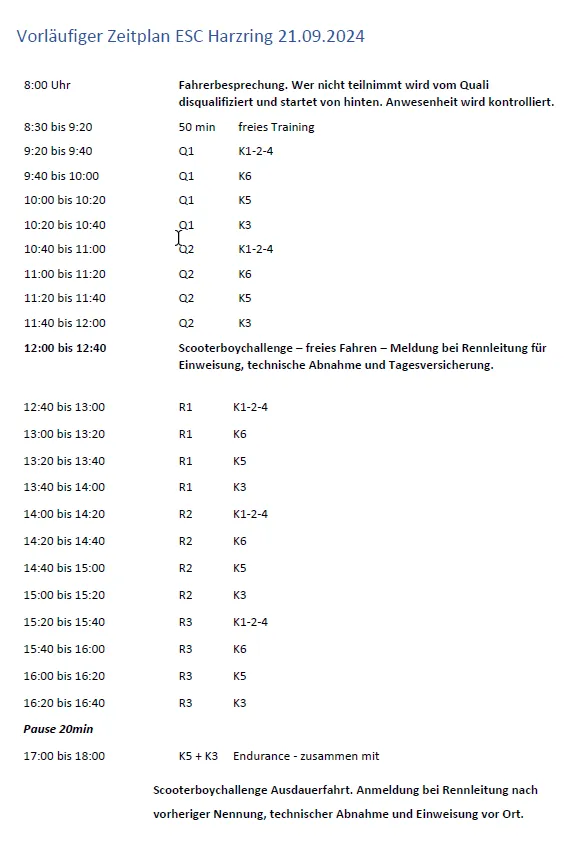 Am fr./ sa. den 20.09. / 21.09. ist am harzring reinstedt unser letztes esc Wochenende. Letztes Jahr haben wir die Stunde Mittagspause am Samstag an scooterboys verschenkt, die ihren Roller gerne mal im Kreis schicken wollen. Das würde ich dieses Jahr gerne wieder machen.Bedingungen: