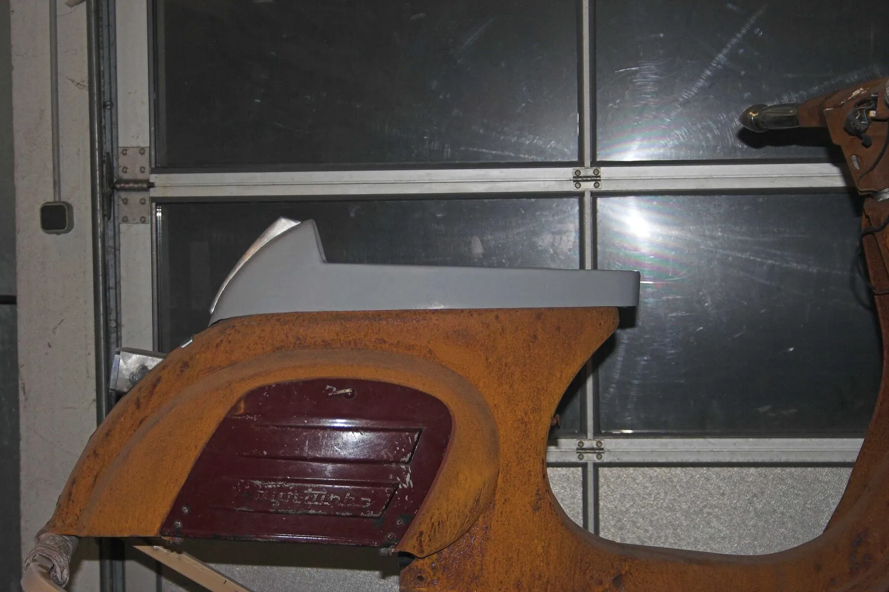 montag abend hab ich das blech von lack, rost und zink befreit und dienstag früh hat mir der roberto das dingens durchgeschweist.heute konnte ich dann ein wenig flexen, dengeln, verputzen und grundieren und jetzt schauts so aus: