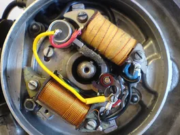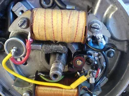 Alle Kabel sind erneuert und die Spule für den Zündfunken ist neu. Die Zündkerze ist neu und der Kontaktgeber ist auch neu. Der Kondensator wurde ebenfall ausgewechselt. Ddei Kabel, rot, grün und schwarz gehen gehen von der Zündergrundplatte ab und sind noch nirgendwo angeschlossen.