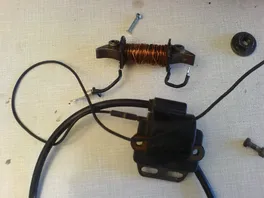 Es sei zu erwähnen, dass ursprünglich die Spule, von der aktuell das Zündkabel abgeht, noch von einer externen Spule ergänzt wurde. Ich hoffe, diese "Umrüstung" stellt kein Problem dar. Anbei drei Fotos- auf zweien ist die Verkabelung zu sehen und auf dem dritten sieht man die alte Spule mit der externen Zündspule.